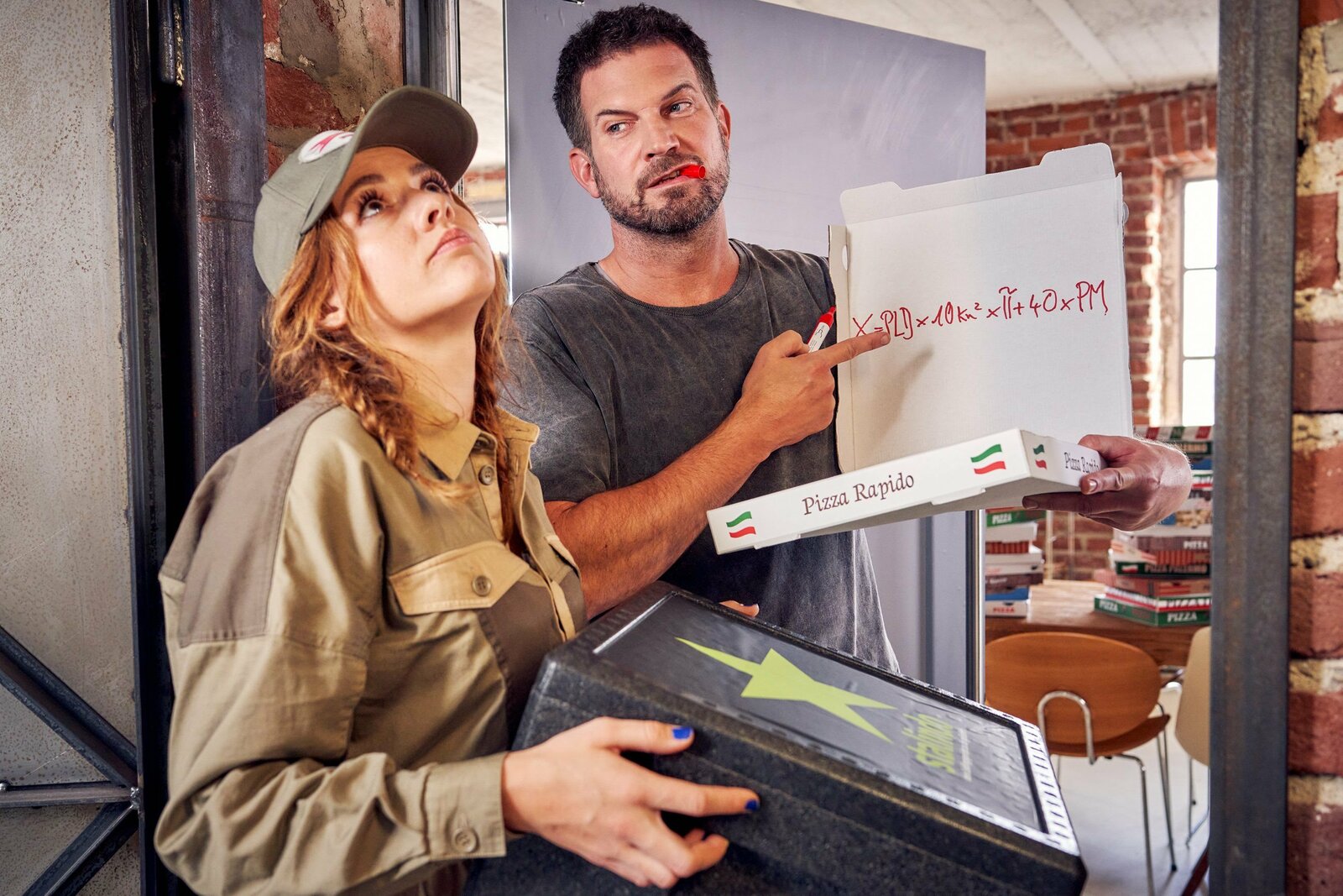 X=PLD*10KM²*p+40*PMDavid (Simon Böer) hat eine verblüffende Gleichung, die Betty (Yvonne Pferrer), die als Pizzabote jobbt, ziemlich blöd da stehen lässt. +++Bild: © TVNOW / Frank Dicks