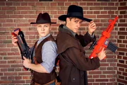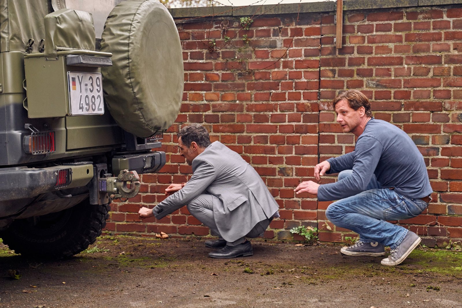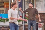 Irgendwie war's besser, als er noch nicht geredet hat...Stefan Vollmer (Hendrik Duryn, l.) kommt zur Trinkhalle und wird neben dem wütenden Mob mit einem bewaffneten Achim Blonsk (Urs Fabian Winiger) konfrontiert...Bild: © RTL / Frank Dicks