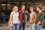 Entweder völlig bekloppt, oder StahleierStefan Vollmer (Hendrik Duryn, r.), Karin Noske (Jessica Ginkel) und Kevin (Moritz Klaus) besuchen Kevins Bruder Heiko (Frederic Heidorn, 2.v.l.) in der Werkstatt.Bild: © MG RTL D / Frank Dicks