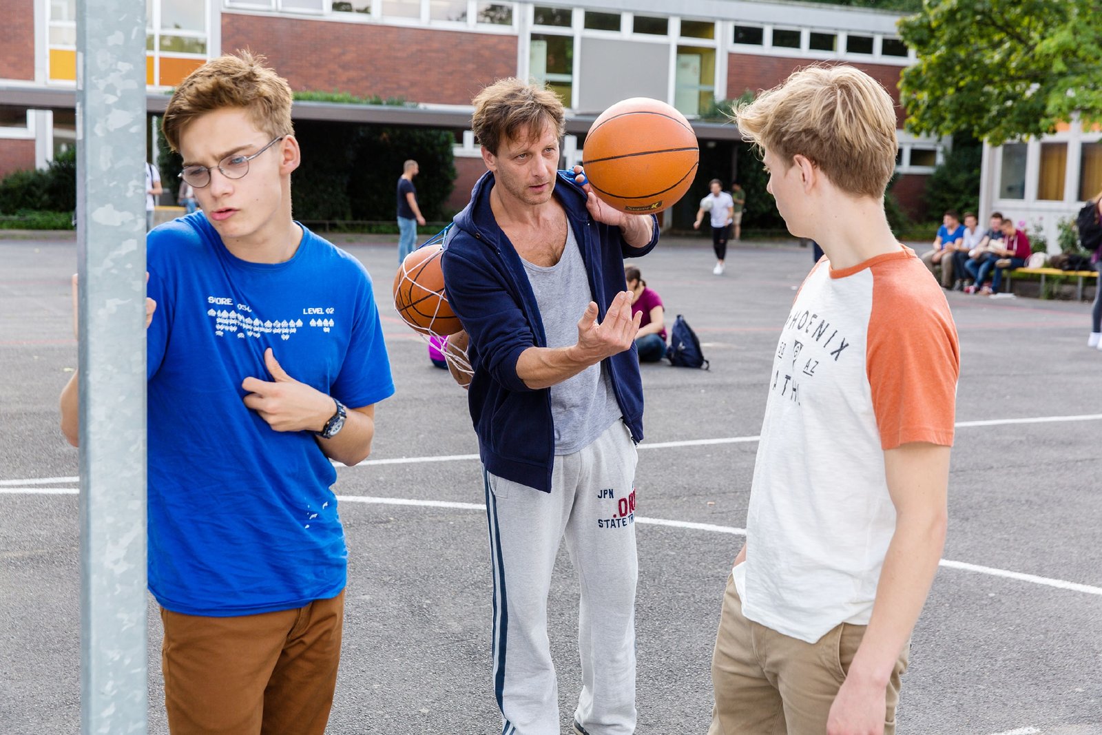 Entweder völlig bekloppt, oder StahleierKarin (Jessica Ginkel), Stefan (Hendrik Duryn, r.) und der neue Lehrer Patrick (Eugen Bauder) auf dem Schulhof.Bild: © MG RTL D / Frank Dicks