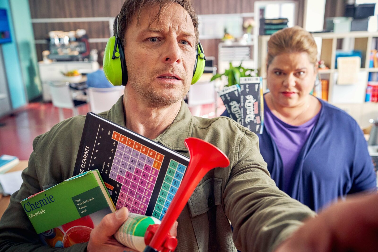 Influencer, nicht InfluenzaStefan (Hendrik Duryn) erklärt Direktor Rose (Ulrich Gebauer, l.), dass Felix (Mike Singer, r.) keine Grippe hat, sondern Influencer ist. Rose interessiert sich allerdings mehr für Felix schlechte Noten! +++Bild: © RTL
