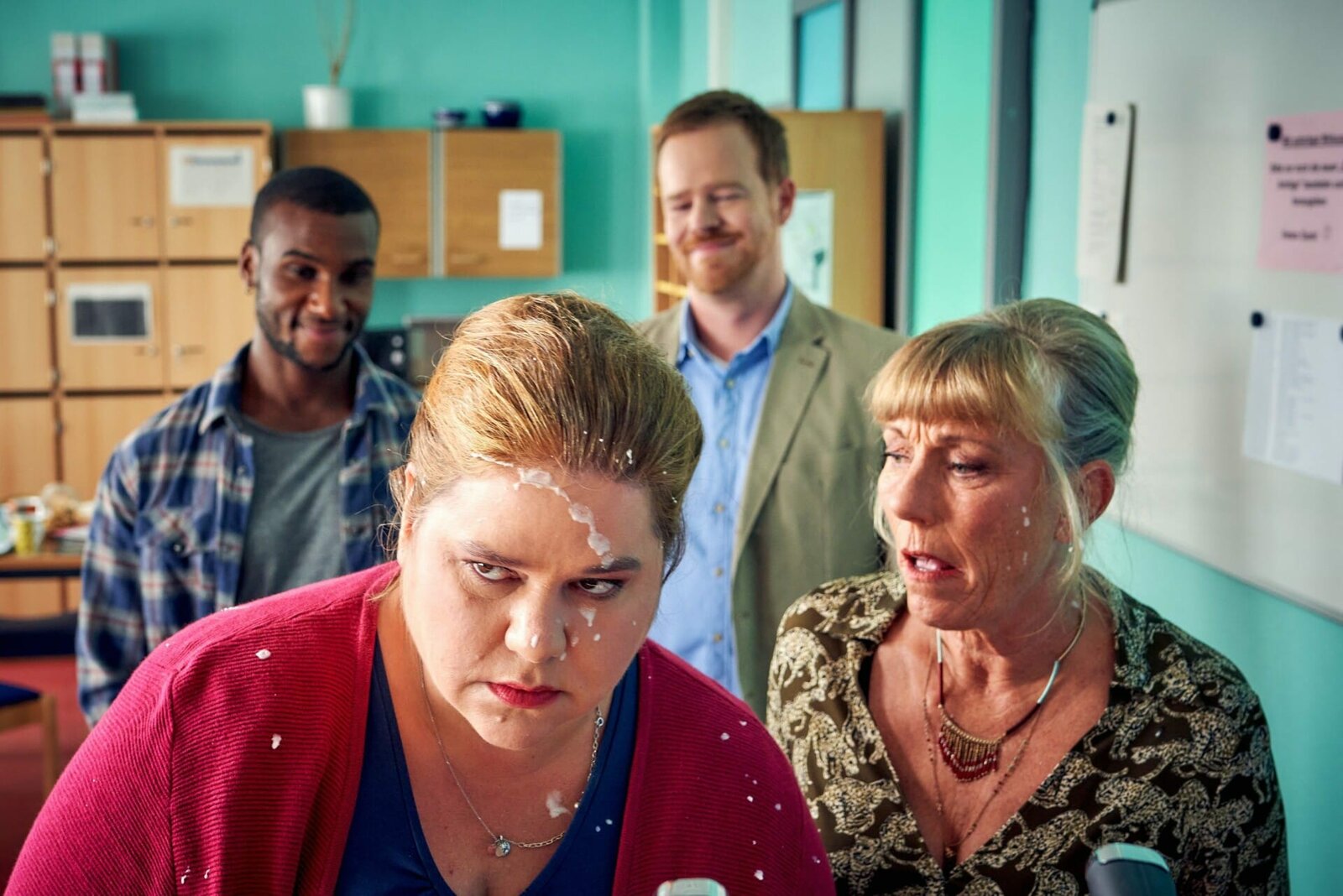 Der hat einfach zu viel EnergieBarbara (Nadine Wrietz) und Frau Cornelius (Antje Lewald, r.) wollen sich im Lehrerzimmer heimlich auf den Barista-Kaffeeautomat stürzen und werden von den Karoliner Lehrern Kai (Tijan Njie, hi.l.) und seinem Kollegen (Jens Biervert) erwischt. Sie dürfen sich jedoch gerne einen Kaffee zubereiten. Jedoch mißlingt der Versuch. +++Bild: © TVNOW / Frank Dicks