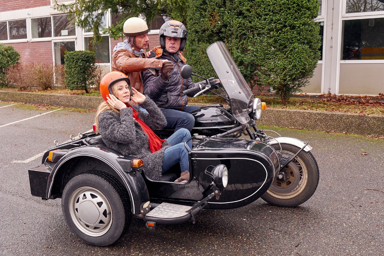 Wusste gar nicht, dass Sie so'ne Dramaqueen sindKarin (Jessica Ginkel) und Stefan (Hendrik Duryn, 2.v.l.) wurden von einem Motorradfahrer mitgenommen.Bild: © RTL / Frank Dicks