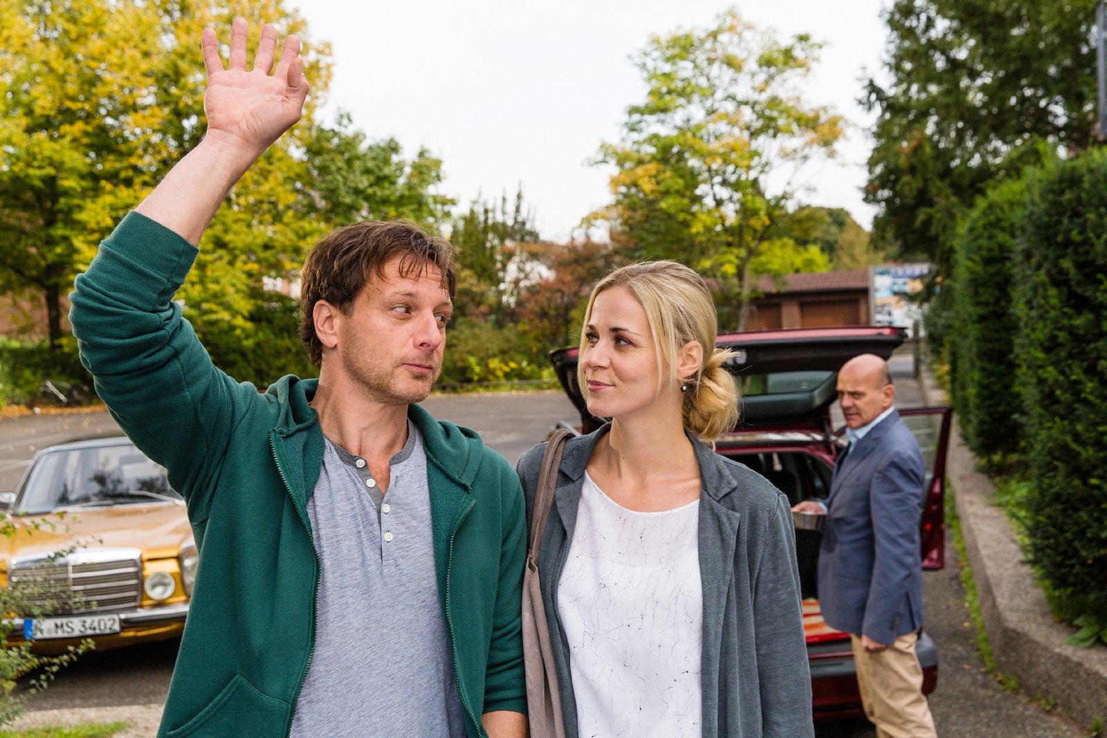 Wusste gar nicht, dass Sie so'ne Dramaqueen sindStefan (Hendrik Duryn, M.) wundert sich über Karin (Jessica Ginkel, l.), die im Dach ihres Autos feststeckt.Bild: © RTL / Frank Dicks