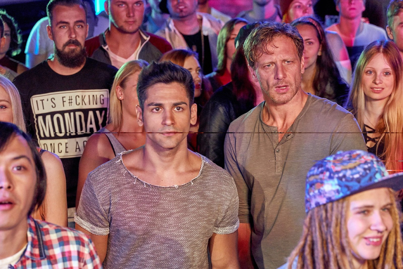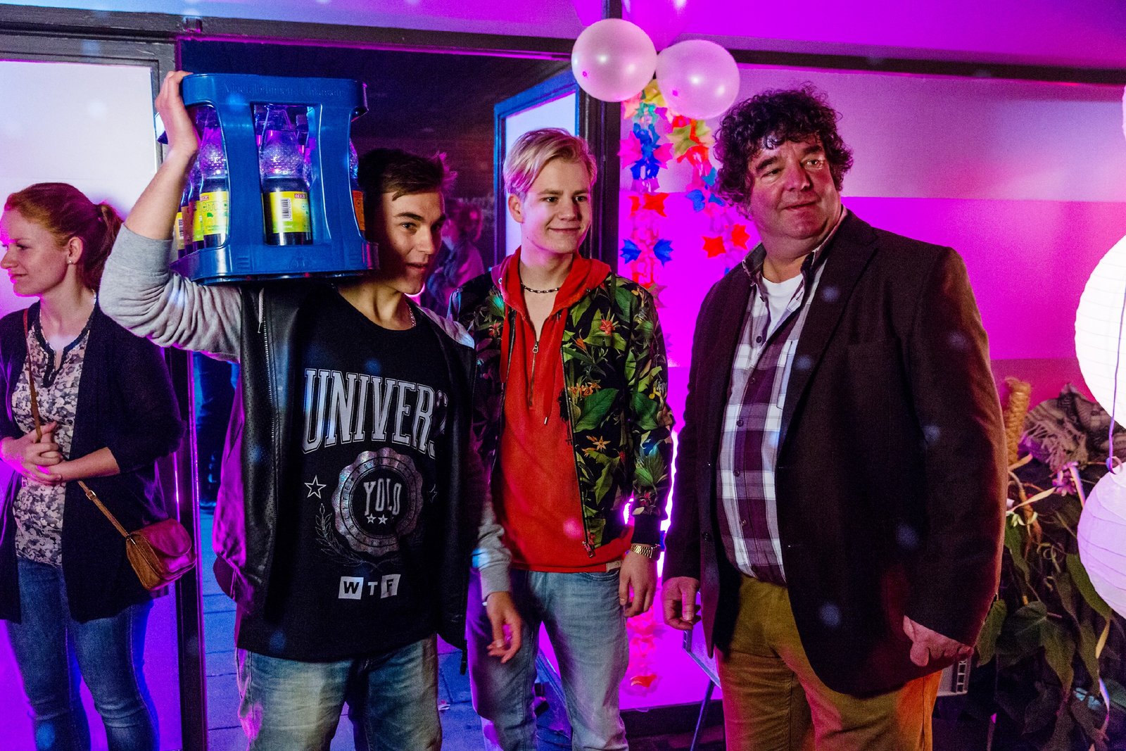 Like in a fucking French Movie ... so unverkrampftSievers (Rainer Piwek, r.) als Türsteher. Jens (Janosch Lencer, l.) und Robin (Samuel Prost) schmuggeln Alkohol auf die Party.Bild: © RTL / Frank Dicks / Sony P