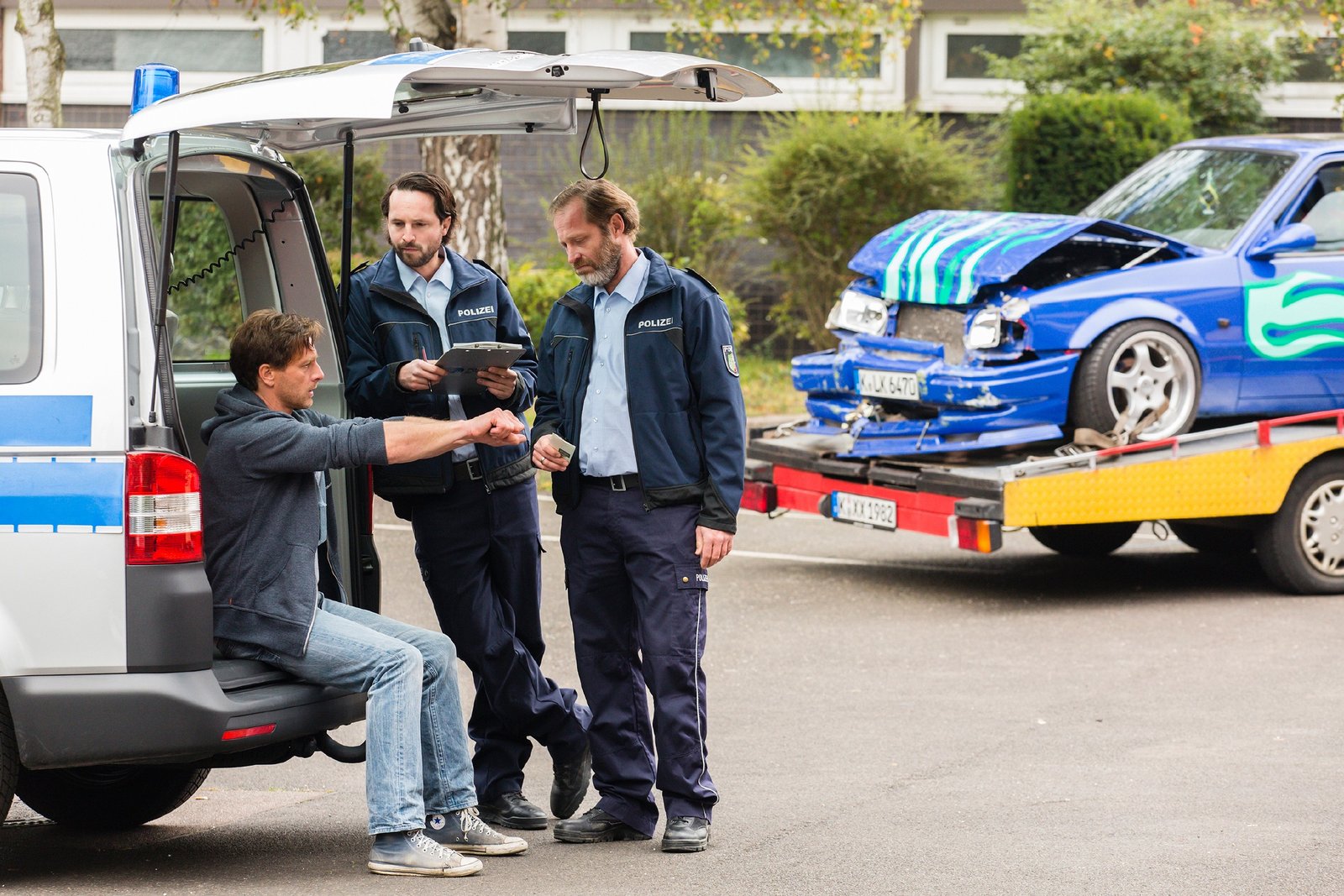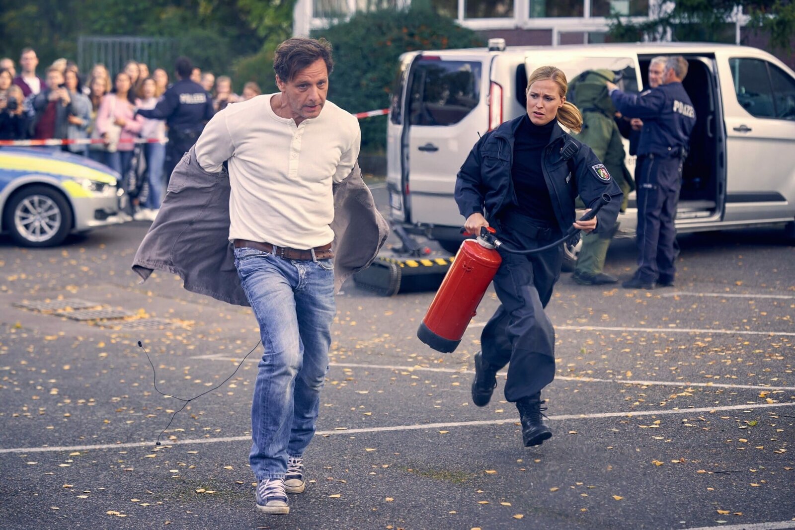 Am Ende kriegt der Held auch noch das MädchenStefan Vollmer (Hendrik Duryn, l.), Karin Noske (Jessica Ginkel) und Direktor Rose (Ulrich Gebauer, 2.v.l.) sehen, wie Marius von der Polizei zur Schule gebracht wird. Rose kennt Marius' Mutter Monika Behrendt.Bild: © MG RTL D / Frank Dicks