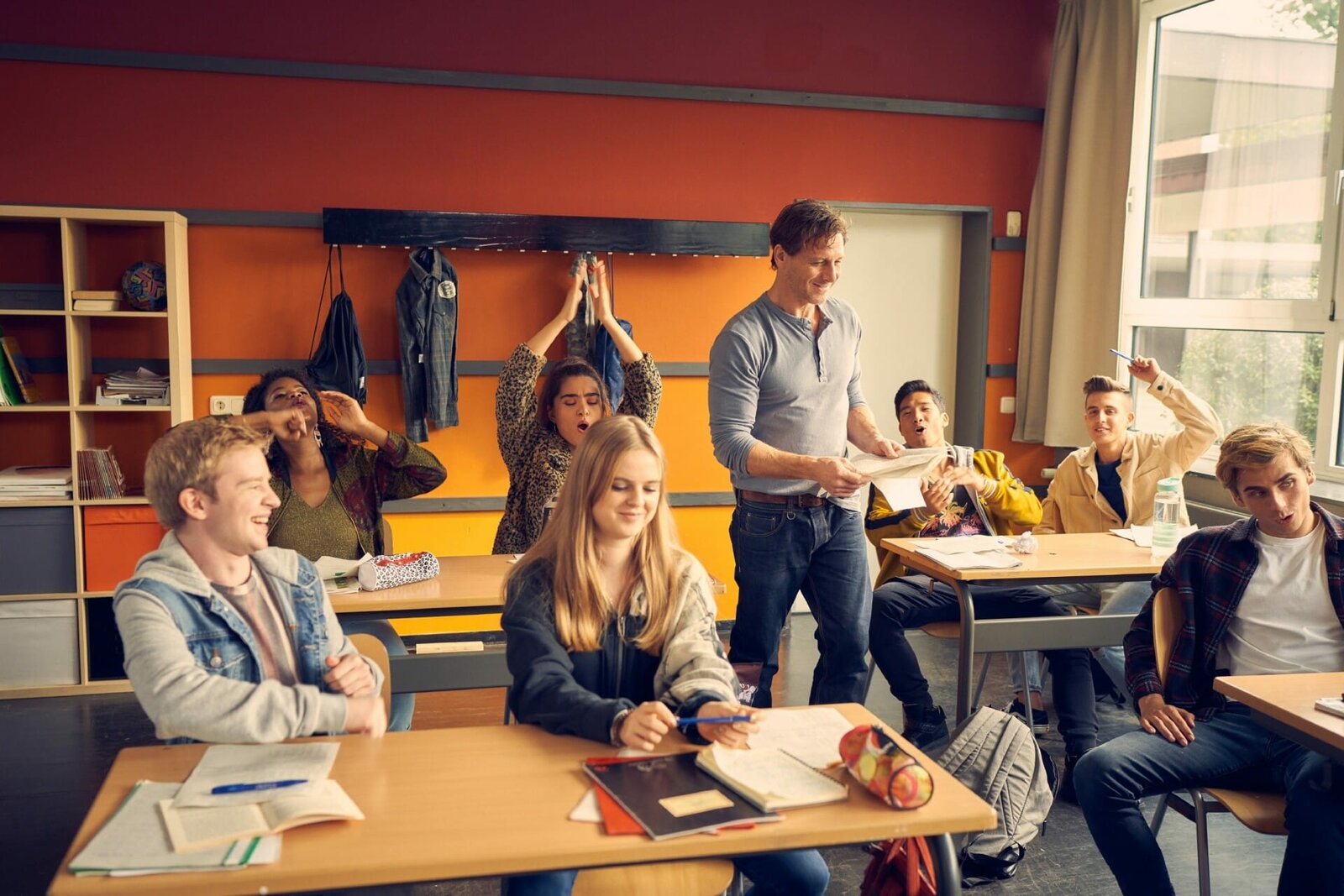 Hast du mich grad' Nazi genannt?!Andres (Jonah Rausch, l.) und der restliche G-Kurs ist von Bonnie (Stella Holzapfel, vorne) und ihrer schlagfertigen und direkten Art begeistert. Vollmer (Hendrik Duryn, stehend) ist überrascht. +++Bild: © RTL / Frank Dicks