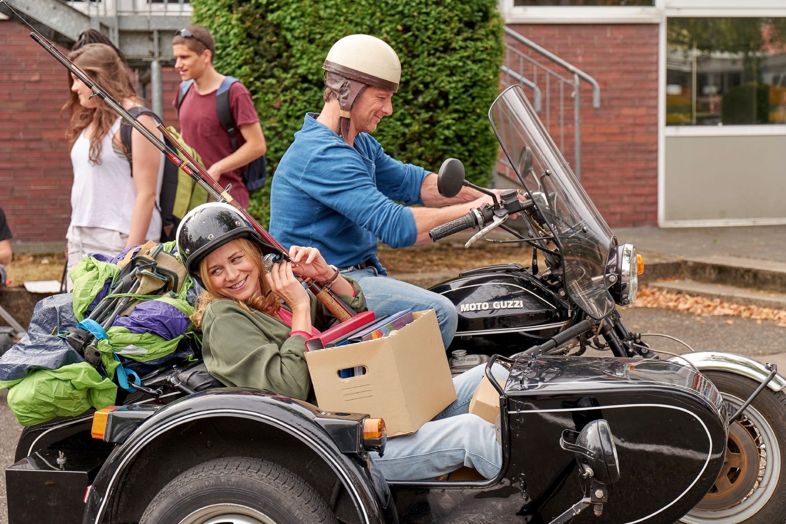 ... so'ne kleine Vollmerette!Stefan (Hendrik Duryn) versucht seinem Sohn Jonas (Merlin Rose, r.) das kaputte Fahrrad zu erklären. Doch Jonas, der frisch gebackene Lehrer an Stefans Schule, braucht einen väterlichen Rat bei der Vorbereitung seines Unterrichts. +++Bild: © TVNOW / Frank Dicks