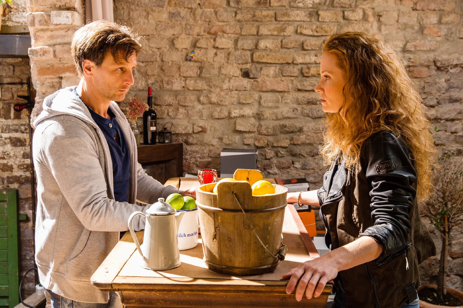 Schwing die Hufe Blondie!Stefan (Hendrik Duryn) erzählt Marie (Sina Valeska Jung), dass Direktor Rose sie erkannt hat und kennenlernen will.Bild: © RTL / Frank Dicks