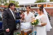Magen-Darm muss man wollenNicht nur der Flur ist rosarot, sondern offenbar auch die Brille der beiden Verliebten Leo (Benedikt Kalcher) und Betty (Yvonne Pferrer). Heiratsantrag inkusive! Da weiß auch der Vollmer (Hendrik Duryn, r.) nicht so recht, was er dazu sagen soll! +++Bild: © TVNOW / Frank Dicks