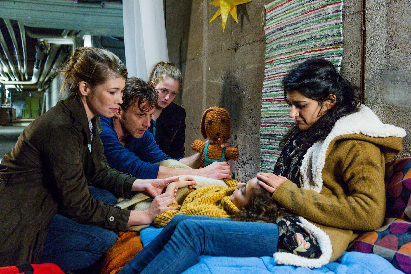 Verknallt? So'n Quatsch!Stefan (Hendrik Duryn, 2.v.l.) hat Jenny (Sonja Baum, l.) gerufen, die bei Waris (Dilara Usmann, lieg.) einen akuten Blinddarm diagnostiziert. Deren Mutter Kadra (Javeh Asefdjah, r.) und Anne (Henriette Nagel) sind in großer Sorge.Bild: © RTL / Frank Dicks / Sony P