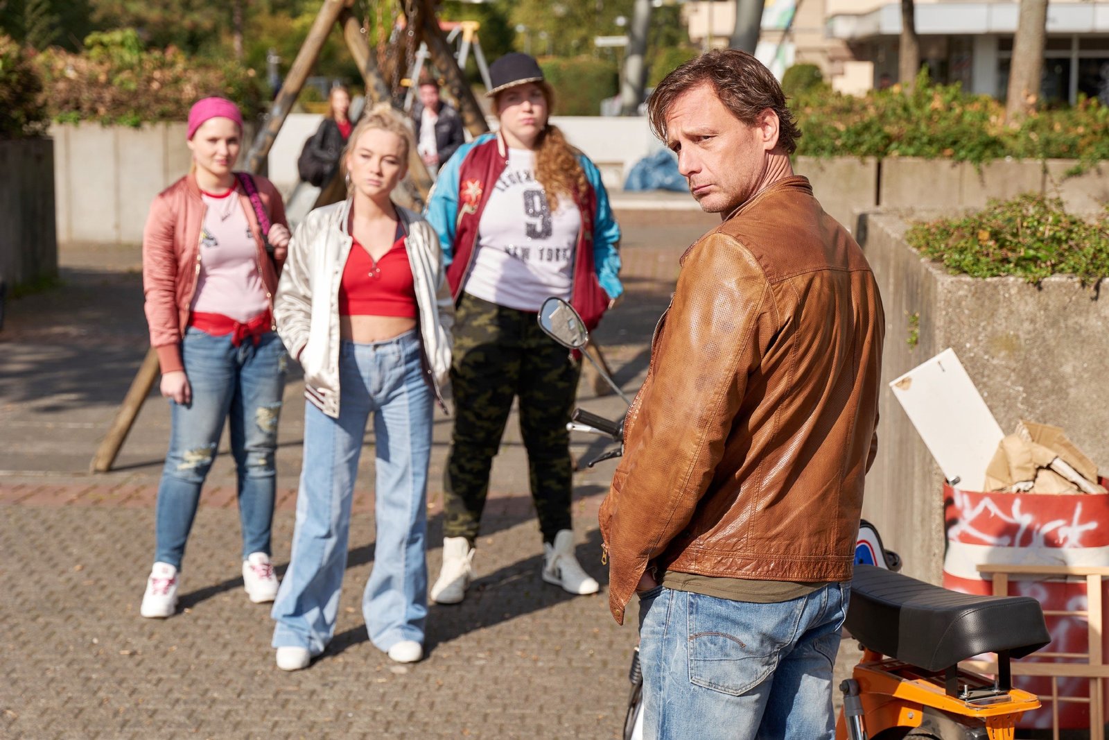 Hast du Pech beim Denken, oder was?!Vollmer (Hendrik Duryn) stattet Maxi (Kyra Kahre, 2.v.l.) und ihren Mädels (Anika Lamade, Julia Jendroßek, r.) einen Besuch in ihrem Viertel ab - in einer Kölner Brennpunktgegend.Bild: © MG RTL D / Frank Dicks