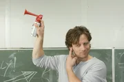 AhmedStefan (Hendrik Duryn) verschafft sich mit einer Stadion-Tröte die Aufmerksamkeit seiner Schüler.Bild: © RTL Passion / Frank Dicks