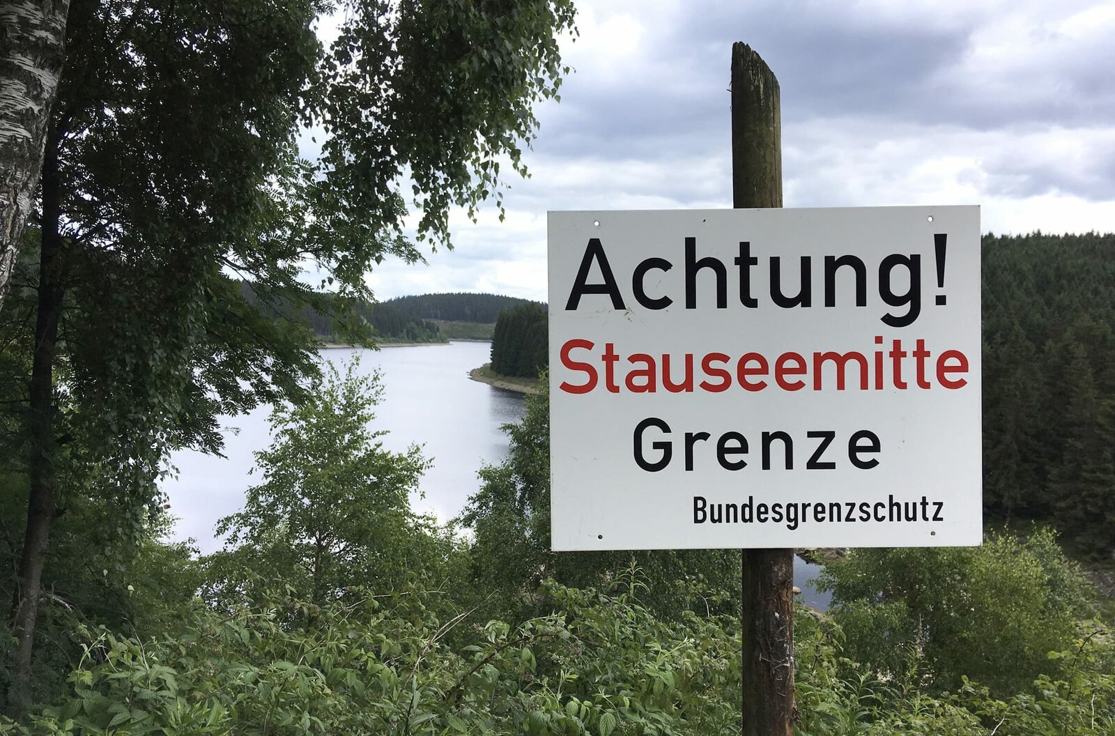 Geteiltes Wasser - Die Eckertalsperre im HarzGrenzschild auf der Westseite der Eckertalsperre.Bild: © MDR/Götz Walter