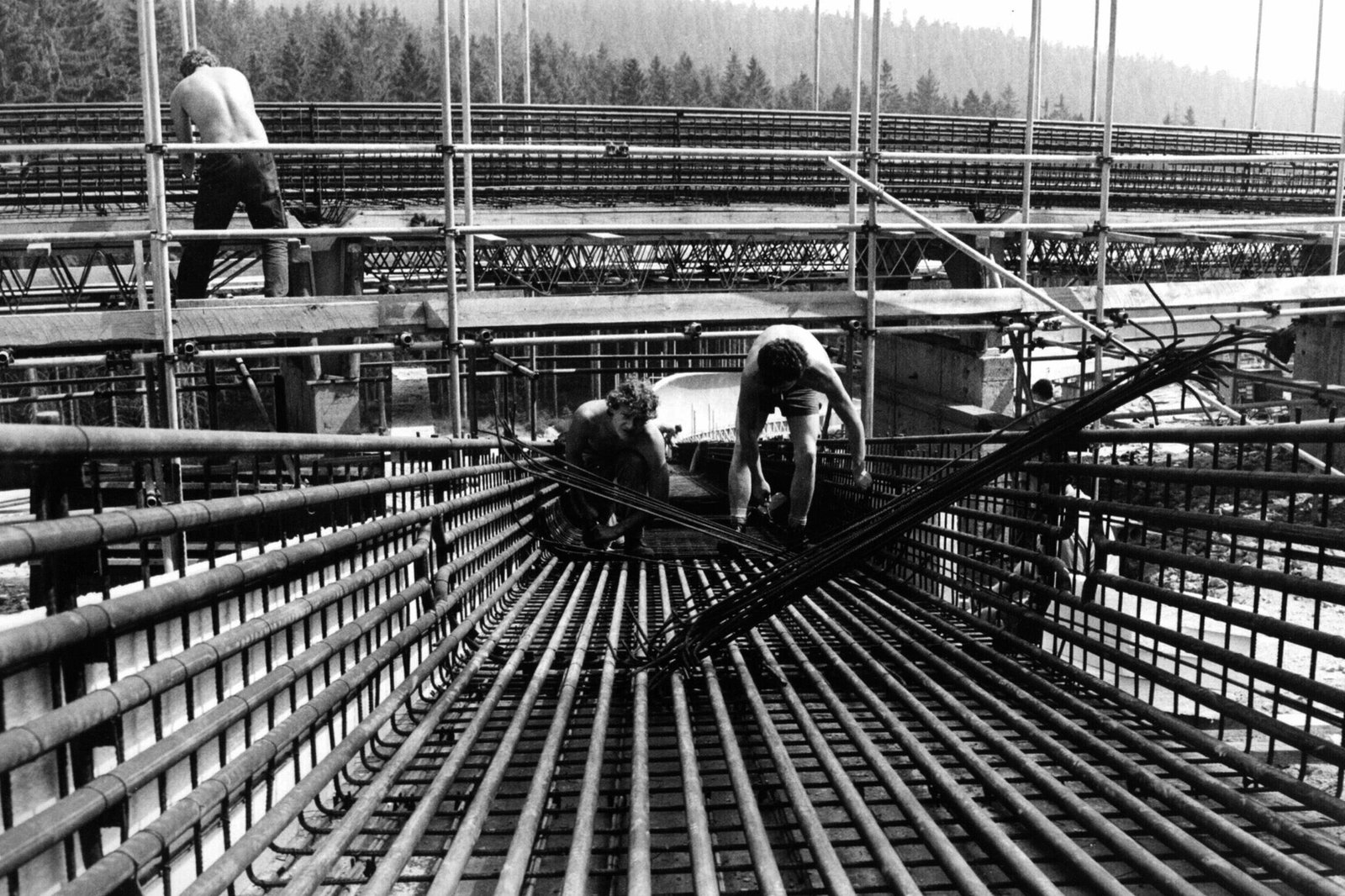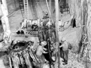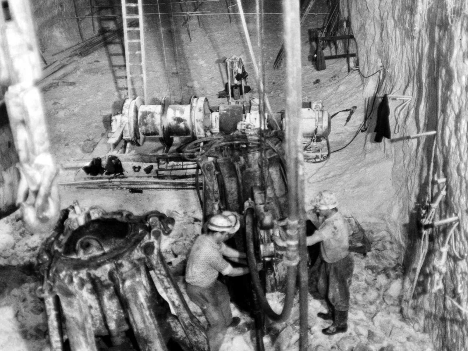 Zielitz - Der Kampf ums Weiße GoldTeufe Schächte Zielitz - Als in den 60er Jahren in Zielitz, nur knapp 50 Kilometer von der Westgrenze entfernt, die Bergleute mit dem Bau des Kali-Bergwerks begannen, verdächtigten die West-Alliierten verdächtigten die Erbauer der Einrichtung von Raketenabschussrampen. Hier die gigantische Konstruktion für den Bau der ersten etwa 800 m in die Tiefe reichenden Schächte. Juni 1966: Abteufen der Gefrierbohrungen für den Schacht Zielitz I. Das Bohrgerüst besteht aus fünf um den Schachtmittelpunkt herum verfahrbaren Einzelgerüsten; rechts drei Gerüste mit je einem Bohrgerät, links die beiden Gerüste zum Einbau der Verrohrung.Bild: © MDR/Gerhard Steinbach