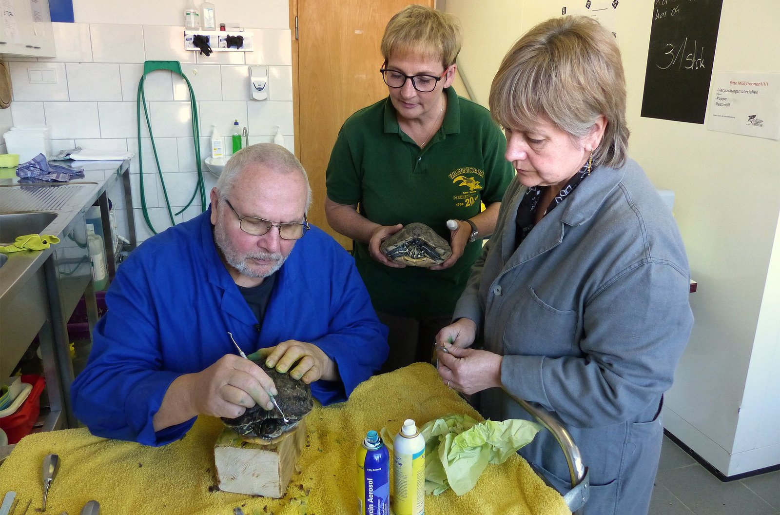 Haifischwelt im Thüringer WaldTierarztbesuch in Meeresaquarium – Dr. Dieter Göbel bei der Behandlung von SchildkrötenBild: © MDR/Rolf Sakulowski