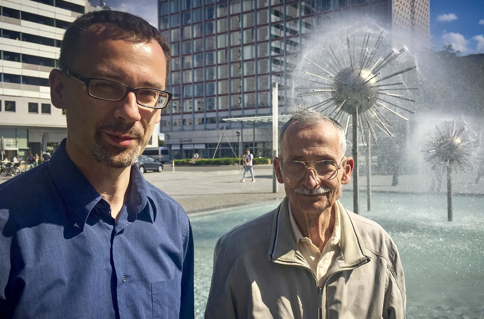 Unsere Boulevards - Die Prager Straße in DresdenPeter und Alexander Bergmann (v.r.) prägten die Kindheitserinnerungen vieler Dresdner und ihrer Besucher: Nach einem Entwurf der Künstlerin Leonie Wirth baut die Kunstschmiede Bergmann den außergewöhnlichen Pusteblumen-Brunnen, der heute noch in Teilen vorhanden ist.Bild: © MDR/Beate Gerber