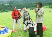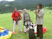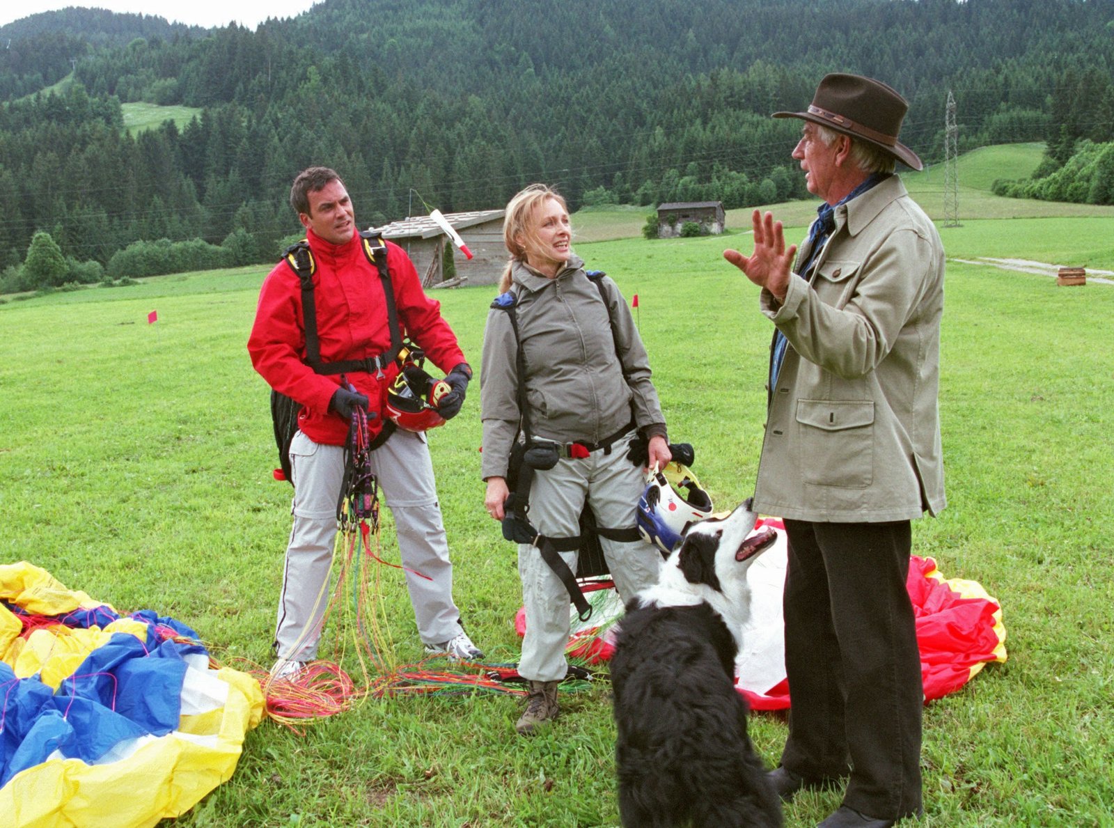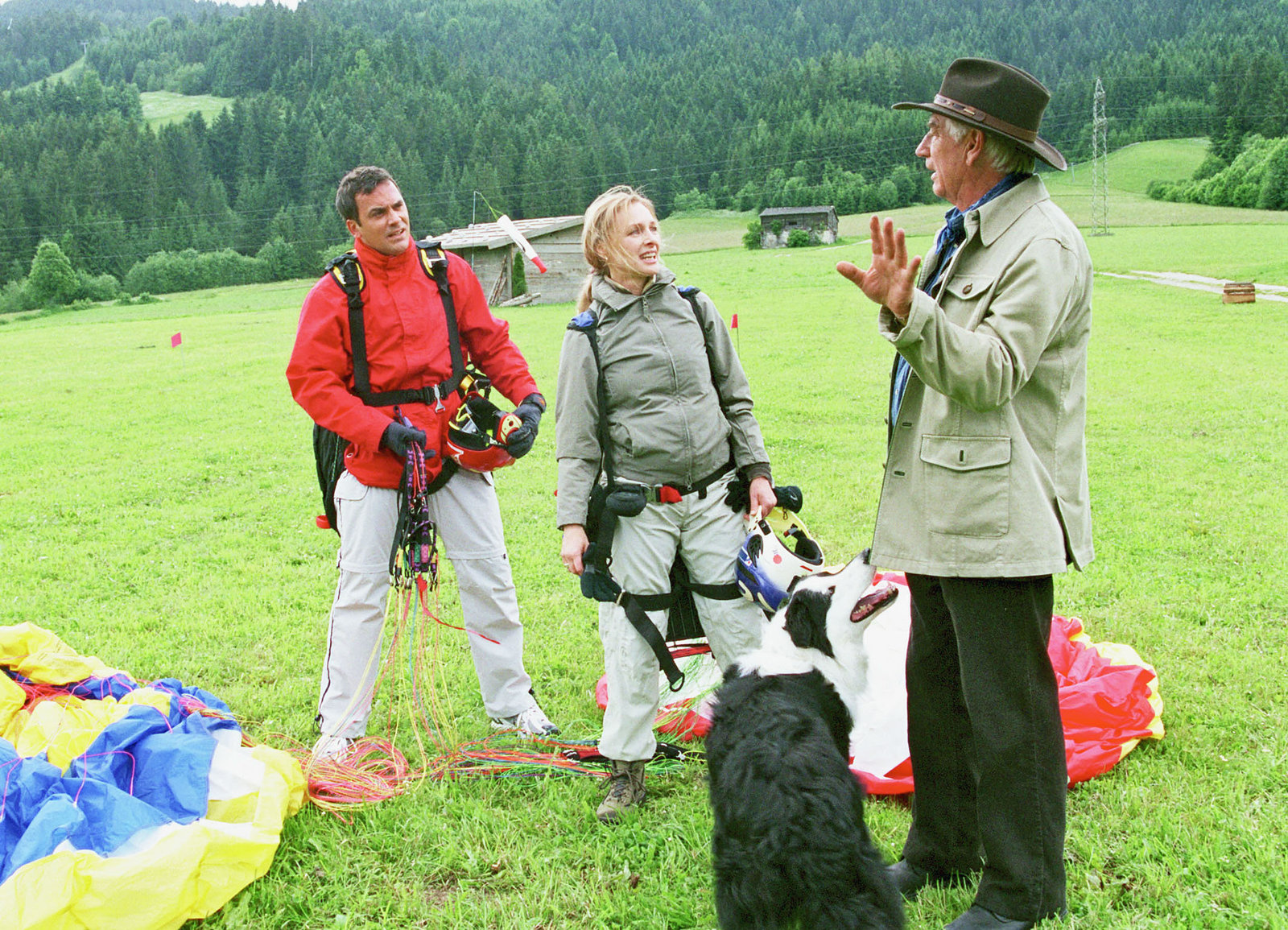 Der Ruf der BergeTierpsychologe Stefan Suttner (Siegfried Rauch, re.) erklärt Dr. Marion Brückner (Marita Marschall) und Ralf (Marcus Grüsser), dass seine Wiese kein Landeplatz ist.Bild: © ARD Degeto/Erika Hauri