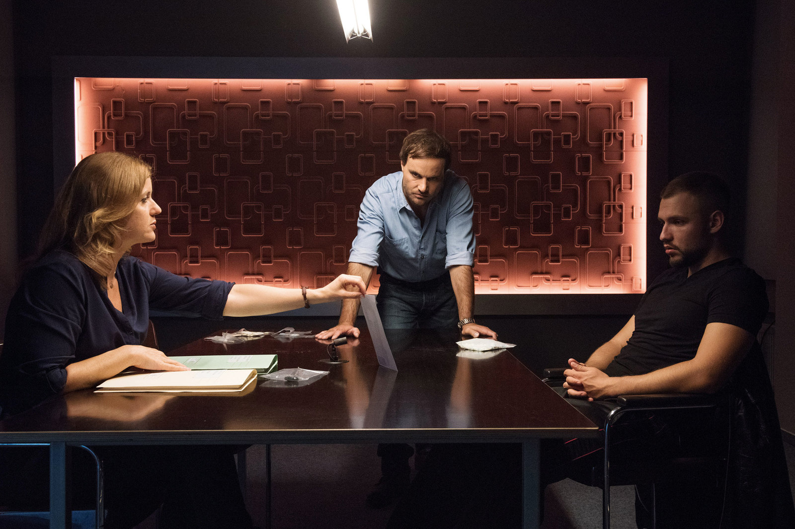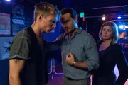 Liebe und GierAuch Luis Schwarz (Max Kupfer, l.) ist im Besitz wertvoller Informationen. Wurde dies seinem Bruder zum Verhängnis? Christian Schubert (Simon Eckert, M.) und Kerstin Klar (Fiona Coors, r.) stellen den widerspenstigen DJ zur Rede.Bild: © Sky Krimi