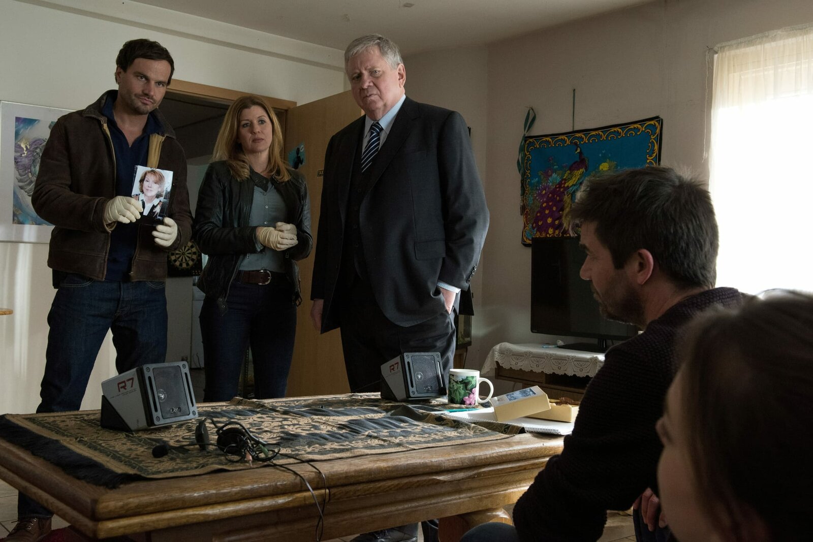 VollstrecktL-R: On the left: Christian Schubert (Simon Eckert), Werner Mohr (Jens Schäfer), Kerstin Klar (Fiona Coors), Emil Kamp (Enno Hesse).Bild: © SRFZDF/Christian Lüdeke