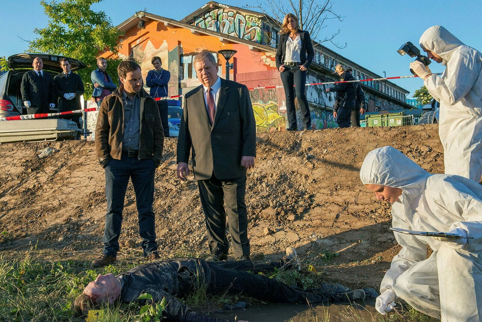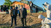 Tödliche FürsorgeStaatsanwalt Bernd Reuther (Rainer Hunold) und die Kommissare Christian Schubert (Simon Eckert) und Kerstin Klar (Fiona Coors) treffen am Tatort ein. Victor Treplik, ein Mitarbeiter des Jugendamts, wurde ermordet.Bild: © SRF/ZDF/Andrea Enderlein