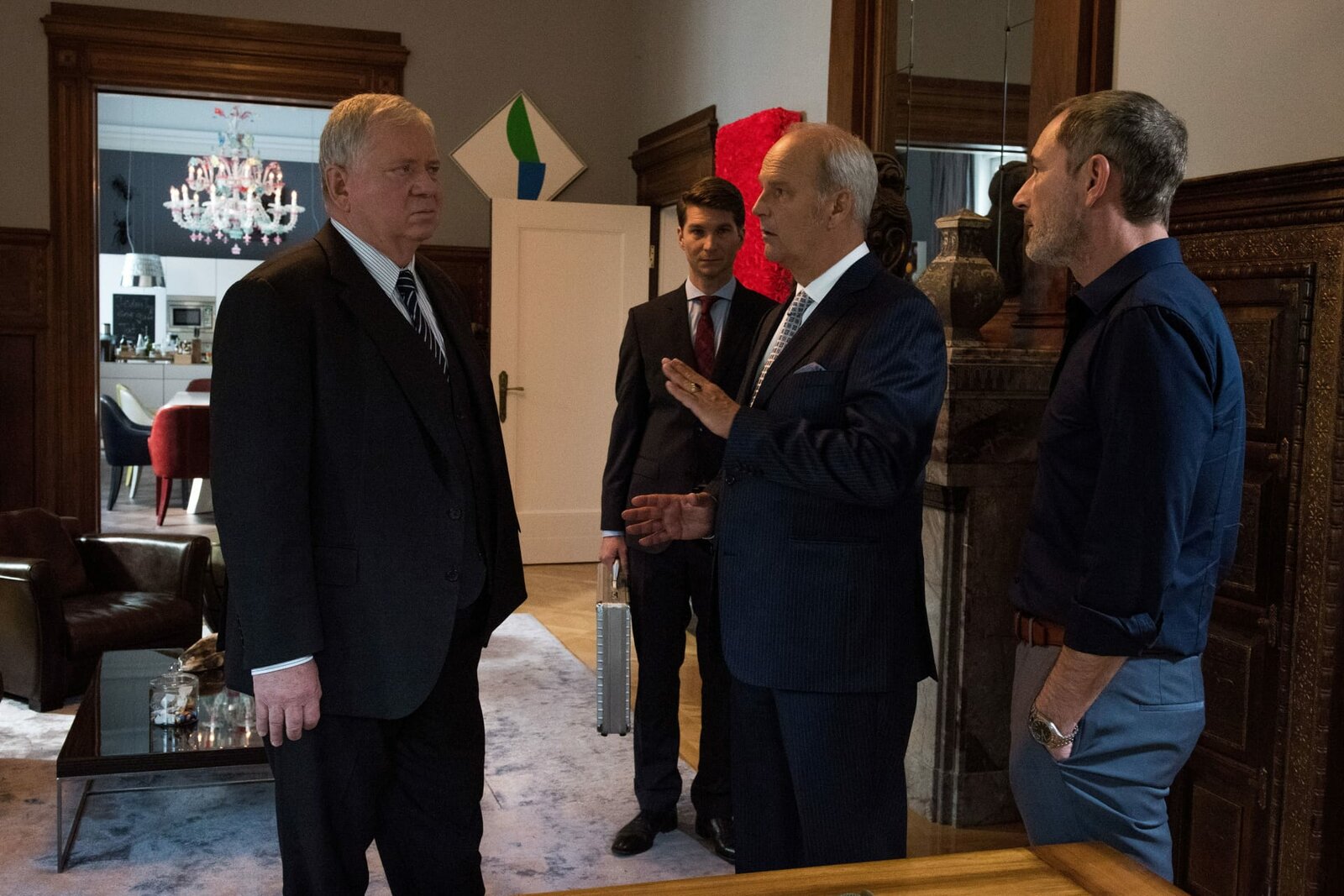 Im Netz der SpinneDer Vater der Tanzschülerin Josephine, Dietrich Laudahn (Heikko Deutschmann, r.), möchte Bernd Reuther (Rainer Hunold, l.) ohne seine Anwälte Simon Eisenbach (Leopold Hornung, 2.v.l.) und Dr. Böttcher (Andreas Borcherding, 2.v.r.) gar nichts sagen.Bild: © Sky Krimi