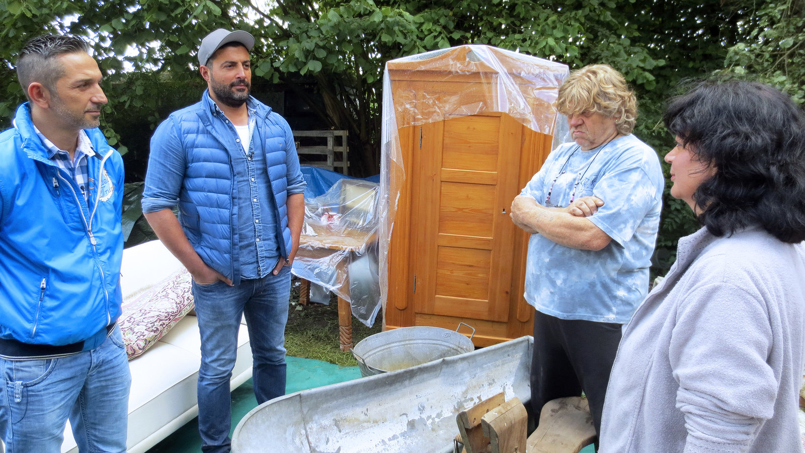 Trödeltrupp Spezial 28Von rechts: Manuela (47) und Wolfgang (60) leben im Chaos. Wolfgang ist – wie er selbst gern zum Besten gibt – eben ein echter Jäger und Sammler. Können die Trödelexperten Sükrü Pehlivan und Mauro Corradino ihn überzeugen, endlich für Ordnung zu sorgen?Bild: © RTL II