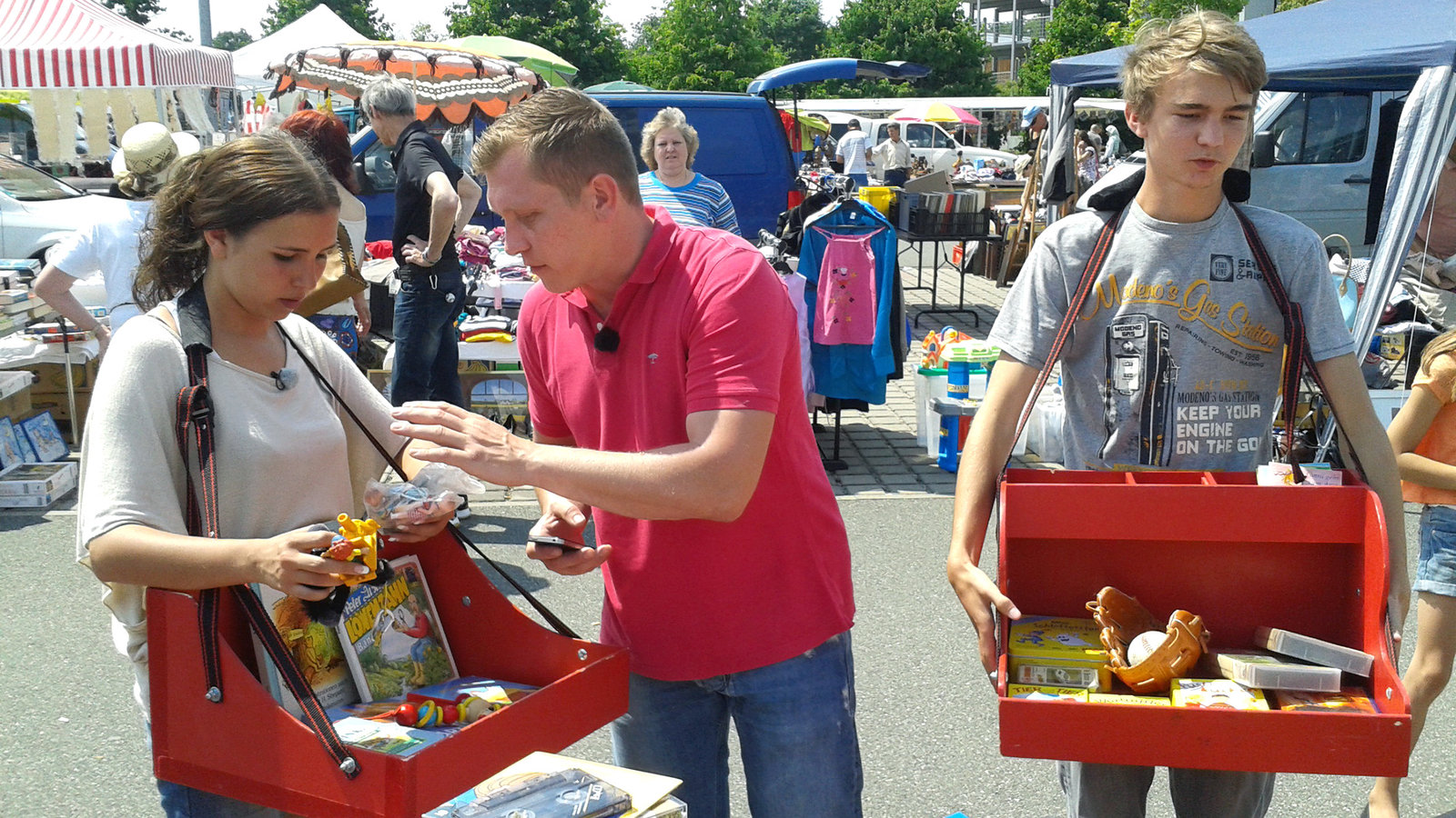 Folge 349Trödelprofi Otto Schulte (Mitte) bespricht mit Selina und Lukas die Bauchladenaktion auf dem FlohmarktBild: © RTL II