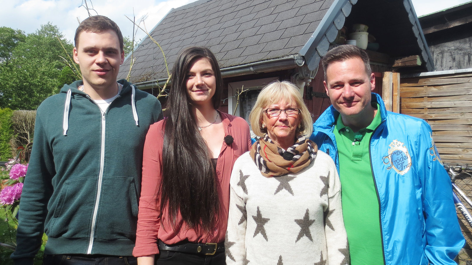 Folge 577Irmgard (68, 2.v.re.) weiß nicht mehr weiter. Ihr verstorbener Mann Manfred hat jahrelang allerlei Trödel gesammelt, der das ganze Grundstück aus allen Nähten platzen lässt. Neben ihrer Vollzeitstelle bleibt da nicht mehr viel Zeit, sich um die Entrümpelung zu kümmern. Für Enkelin Isabelle (19, li.) und ihren Freund Florian (24, 2.v.li.) ist klar: Hier kann nur der Trödeltrupp helfen! Zusammen mit Experte Andi Bierschock (re.) können sie innerhalb weniger Tage die alten Sachen zu Geld machen.Bild: © RTL II