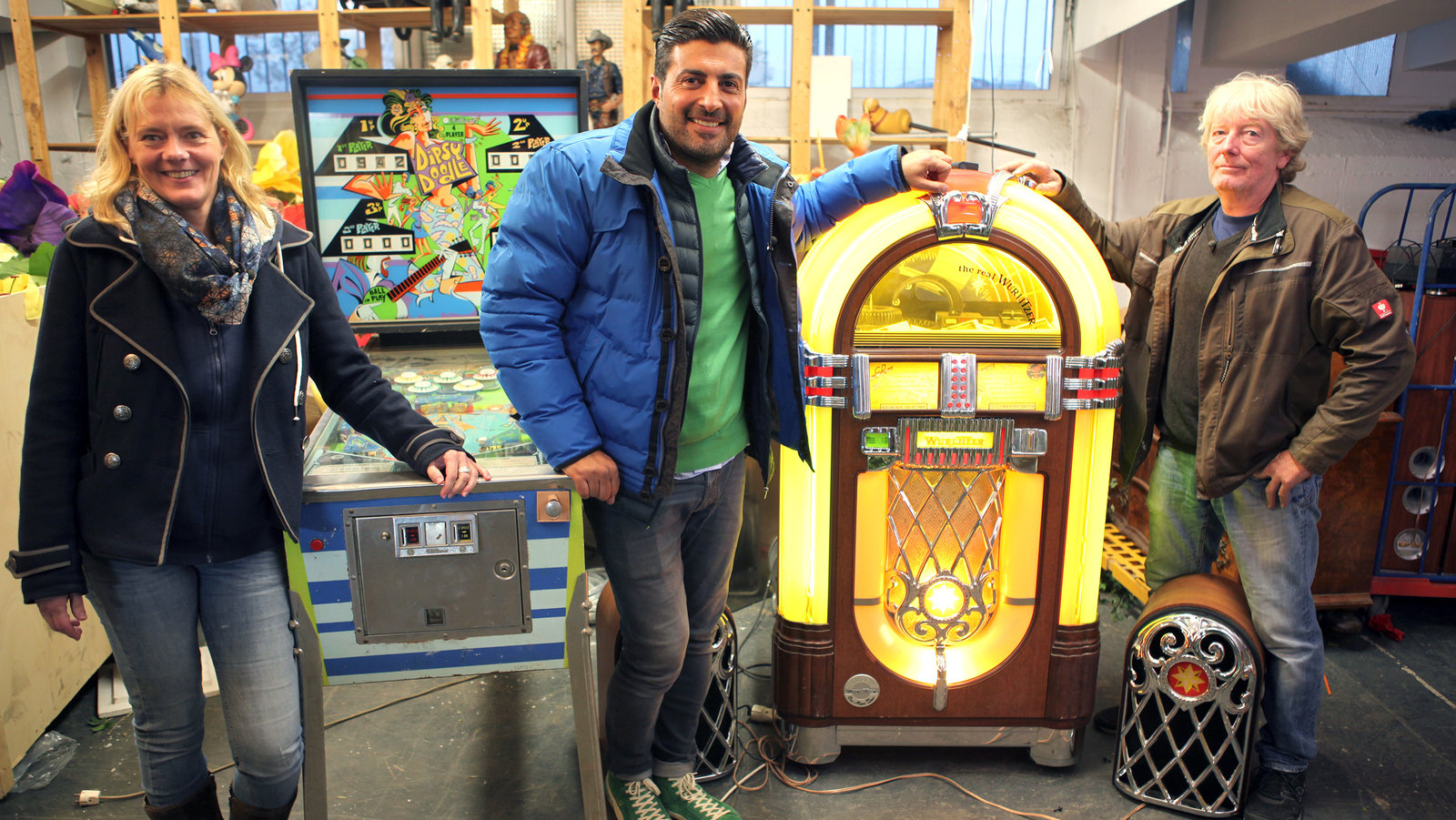 Folge 52Hermann (re.) ist im Besitz von zahlreichen Schätzen.. Experte Sükrü Pehliven (Mitte) findet auch eine Wurlitzer-Jukebox und einen Flipper!Bild: © RTL II