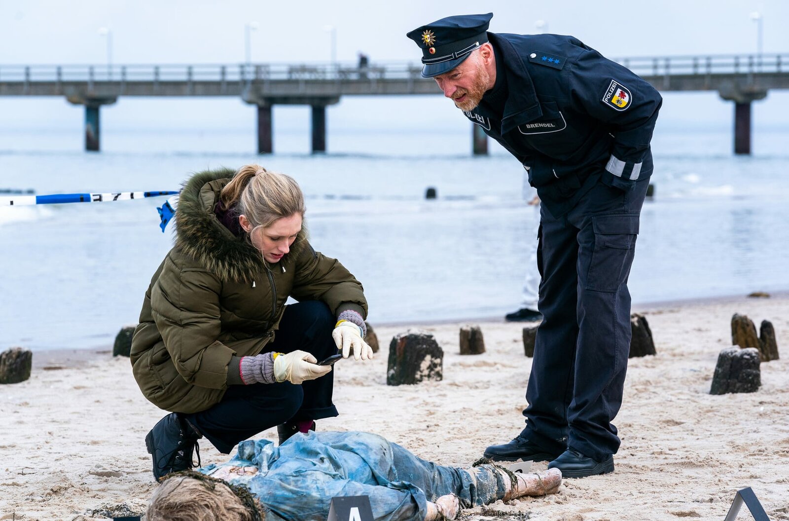 StrandgutEine Frauenleiche ist angespült worden. Ellen Norgaard (Rikke Lylloff) und Holm Brendel (Rainer Sellien) ermitteln.Bild: © NDR/ARD Degeto/Oliver Feist