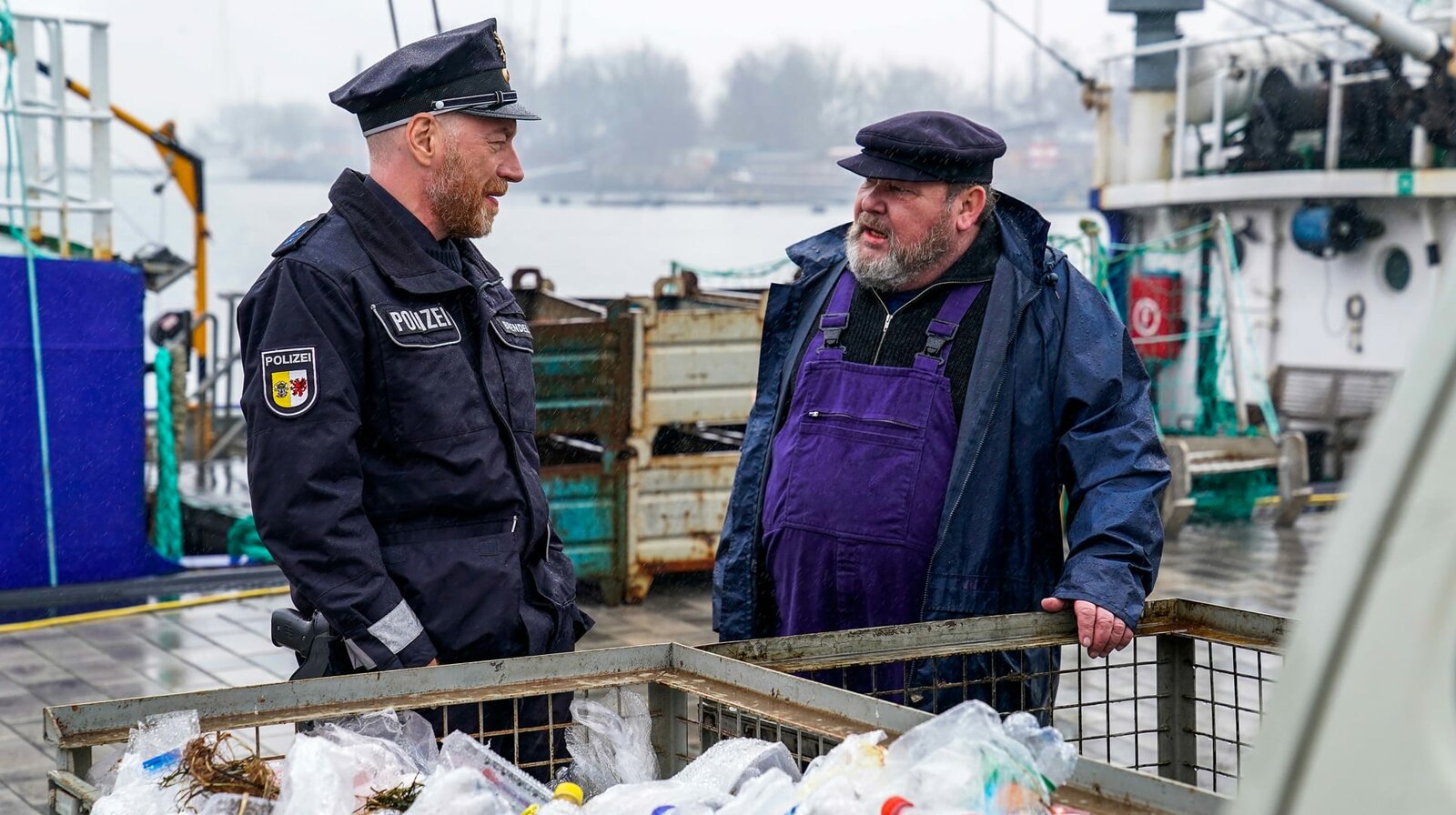 StrandgutHolm Brendel (Rainer Selline) befragt Skipper Henning Schulte (Walter Plathe).Bild: © WDR/NDR/ARD Degeto/Oliver Feist