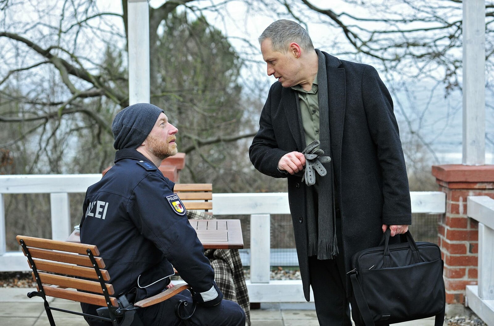 GeisterschiffEin Raubüberfall ist gescheitert: Ellen Norgaard (Rikke Lylloff) und Holm Brendel (Rainer Sellien) nehmen die Ermittlungen auf.Bild: © rbb/NDR/ARD-Degeto/Maor Waisburd