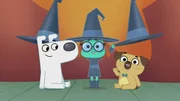 Die Geschichte von der kleinen HexeDie beiden Hunde üben mit der kleinen Hexe ihren großen Auftritt.Bild: © KiKA/Dog Loves Productions Limited 2020