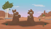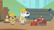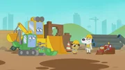 Die Geschichte von der kleinen HexeAuf einer matschigen Baustelle begegnen Dog und Puck zwei glänzenden und einem dreckigen Bagger.Bild: © KiKA/Dog Loves Productions Limited 2020