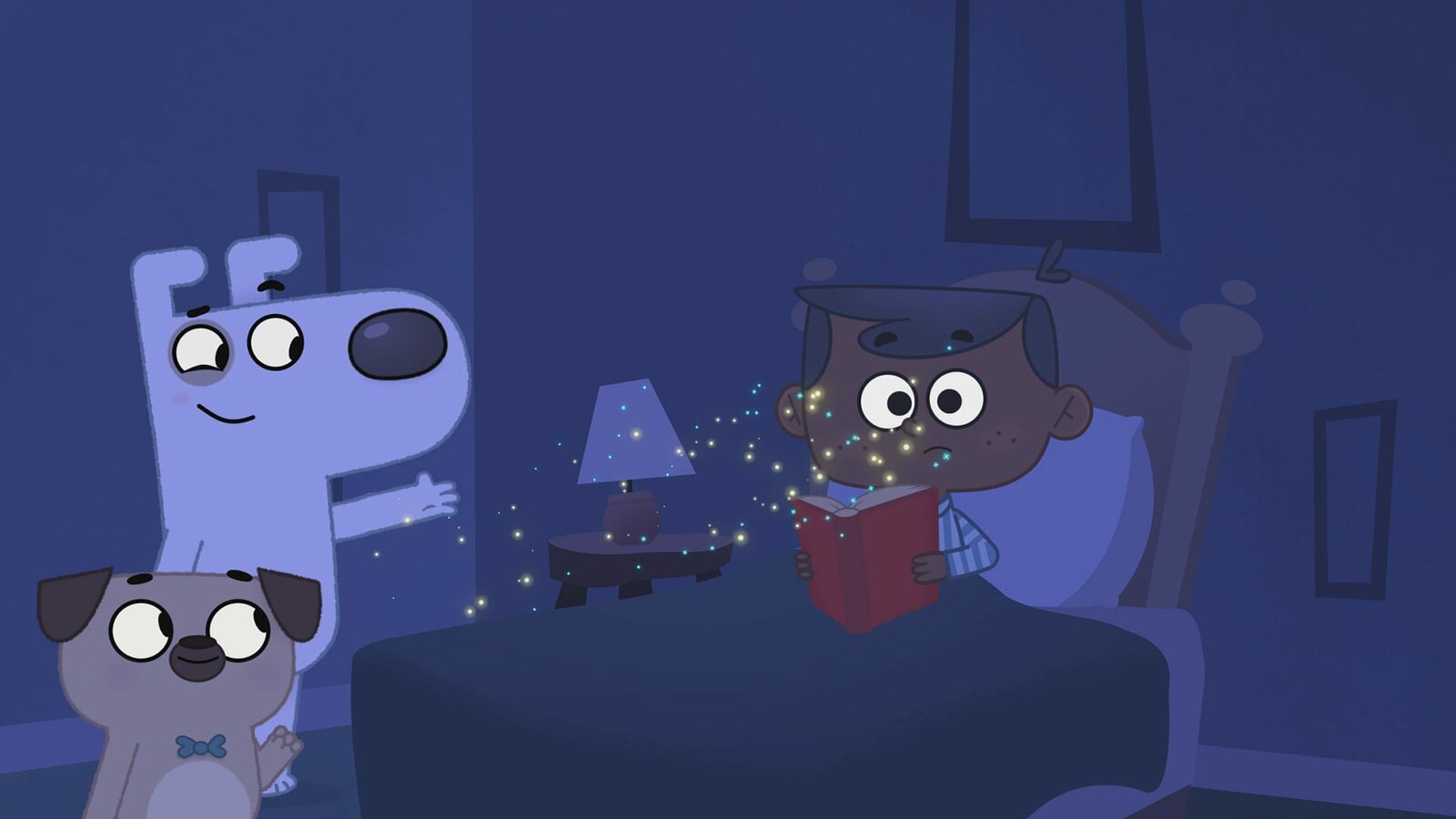 Die Geschichte vom Rätseln und SpielenDog und Puck bringen den Kindern den Mondstaub, der sie in das Traumland bringt.Bild: © KiKA/Dog Loves Productions Limited 2020