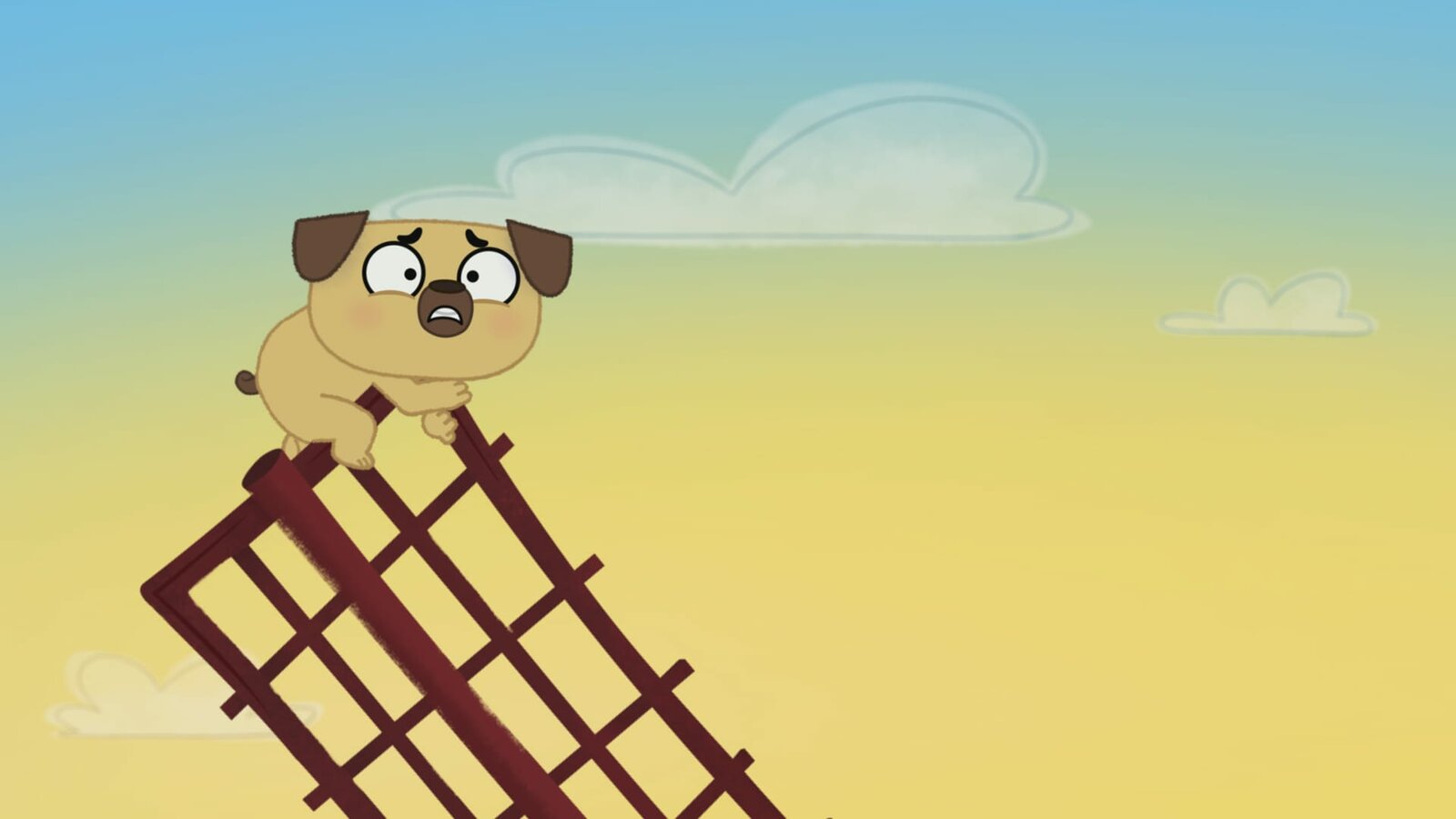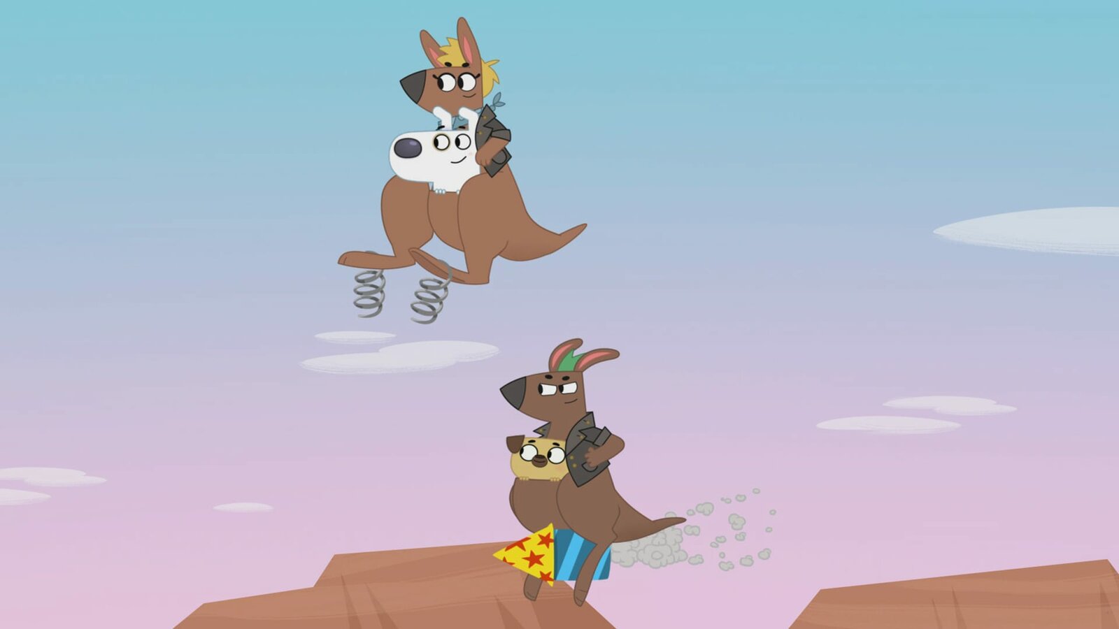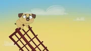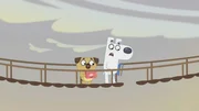 Die Geschichte von Pucks Suche nach der roten FederWie können die beiden über das große Loch in der Hängebrücke gelangen?Bild: © KiKA/Dog Loves Productions Limited 2020