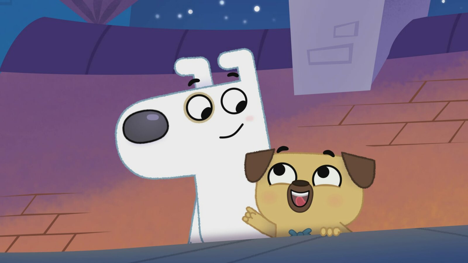 Die Geschichte von der Suche nach dem YetiVom Dach ihres Hauses aus betrachten die beiden Freunde den Sternenhimmel.Bild: © KiKA/Dog Loves Productions Limited 2020