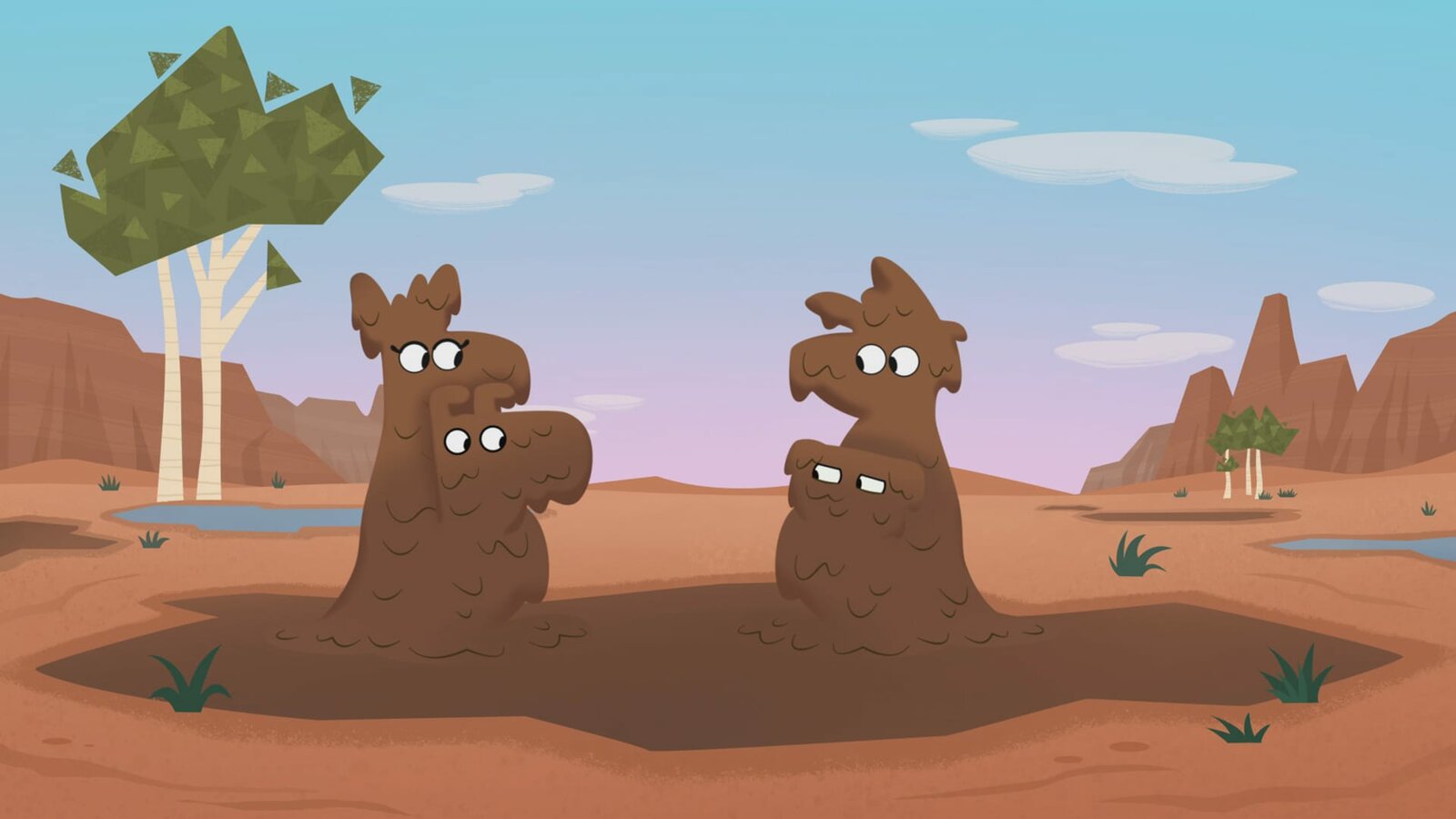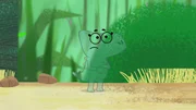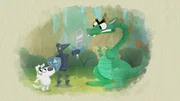 Die Geschichte von drei Ziegen und einer wackeligen BrückeChamäleon Chamelia tarnt sich so gut, dass Dog und Puck sie kaum sehen können.Bild: © WDR/2021 Cyber Group Studios