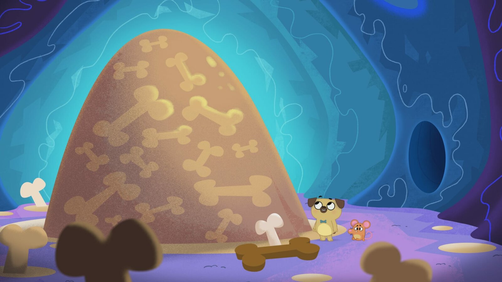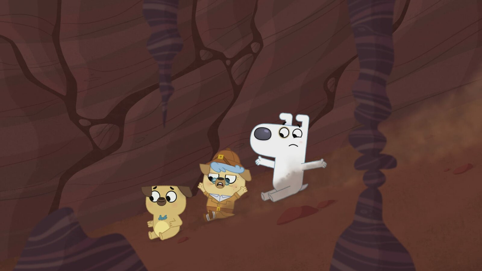 Die Geschichte von Pucks WeltrekordversuchOma Puck und die zwei Freunde rutschen in das Innere der Erde hinab.Bild: © KiKA/Dog Loves Productions Limited 2020