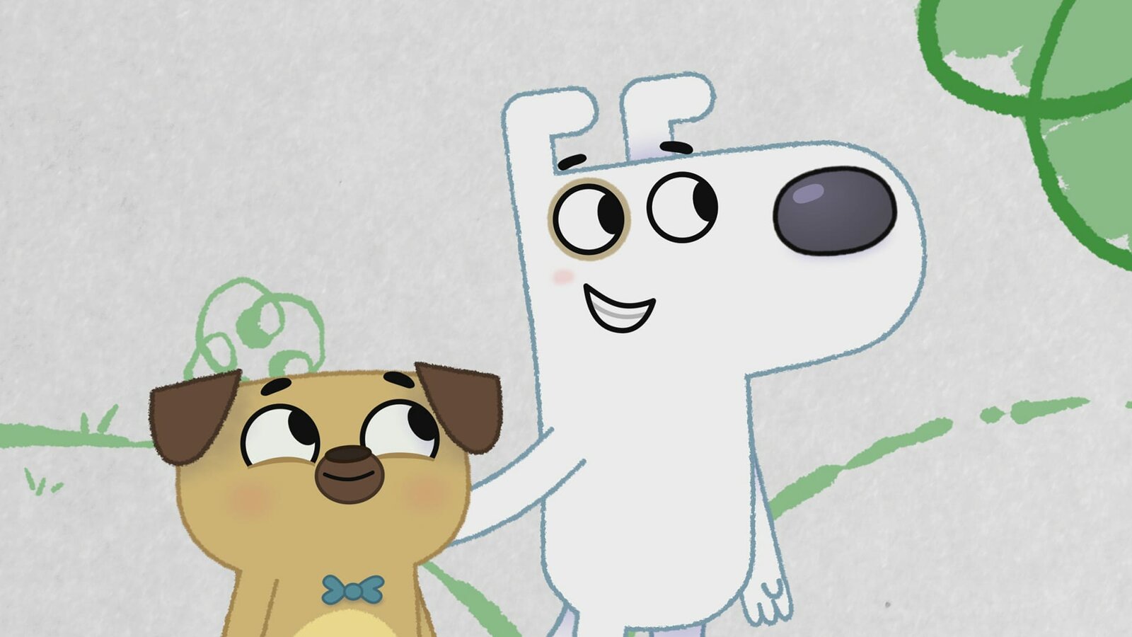 Die Geschichte von Menschen und FledermäusenStaunend schauen Dog und Puck zu, wie auf einem leeren Blatt eine bunte Welt entsteht.Bild: © KiKA/Dog Loves Productions Limited 2020