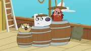 Die Geschichte vom Hut des KapitänsDog, Puck und der Pirat, verstecken sich in leeren Fässern.Bild: © KiKA/Dog Loves Productions Limited 2020