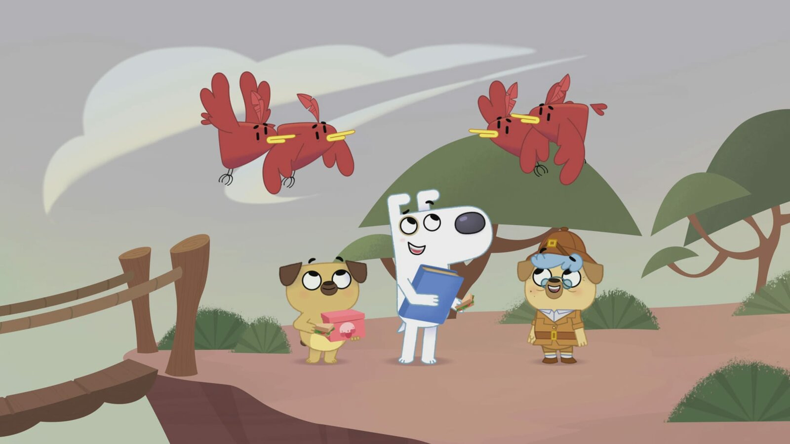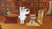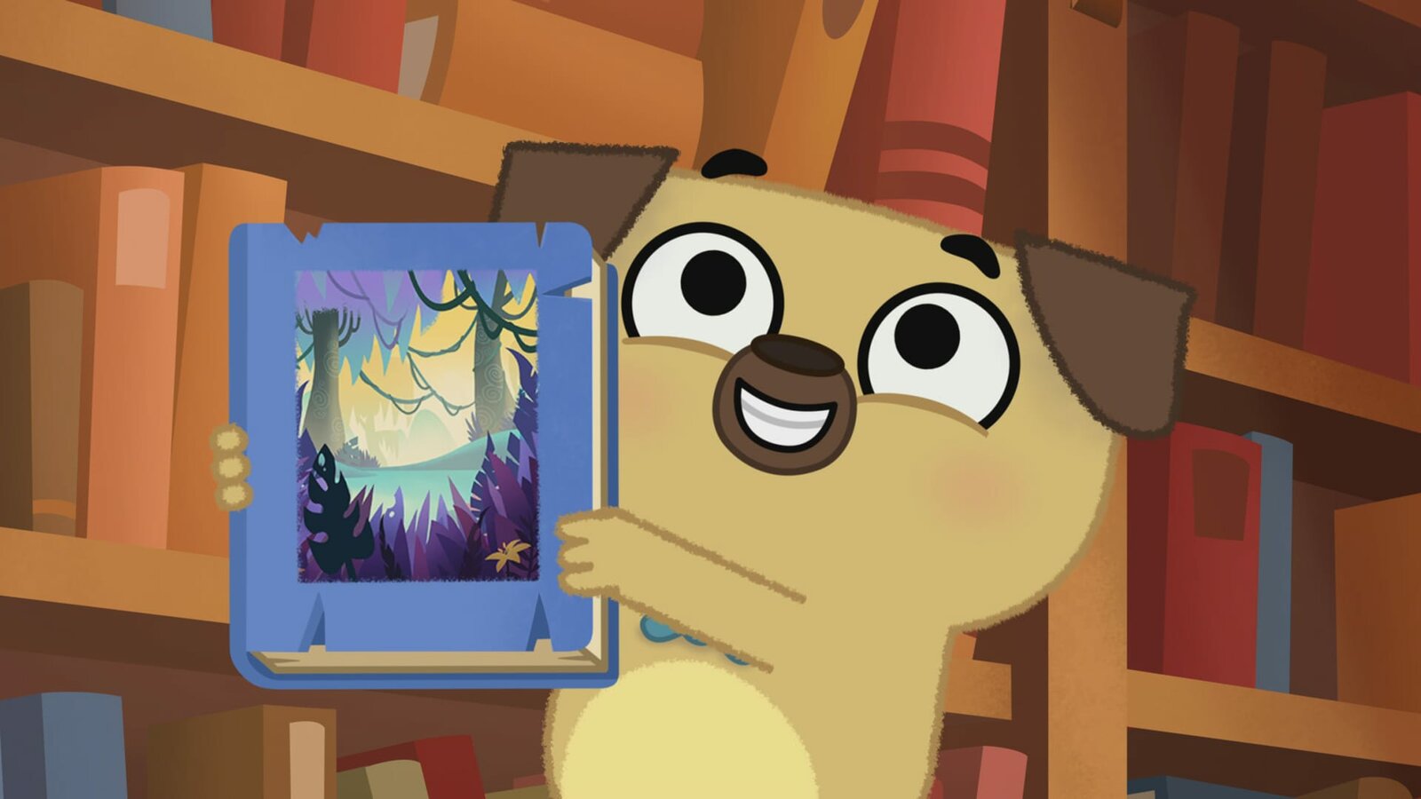 Die Geschichte von Dogs erstem BuchPuck schlägt Dog vor, sein allererstes Buch "Der Wumpus" noch einmal zu lesen.Bild: © KiKA/Dog Loves Productions Limited 2020