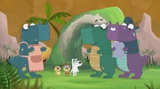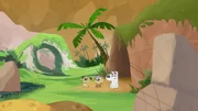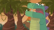 Die Geschichte vom verschollenen FinnEin wilder Dinosaurier begrüßt Dog und Puck mit lautem Gebrüll.Bild: © KiKA/Dog Loves Productions Limited 2020