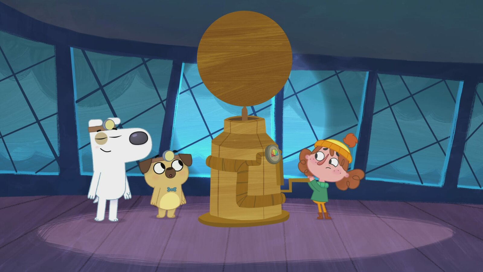 Die Geschichte von den MinitierenIn einem Leuchtturm wollen Dog und Puck herausfinden, wie man Licht ohne Strom erzeugt.Bild: © KiKA/Dog Loves Productions Limited 2020