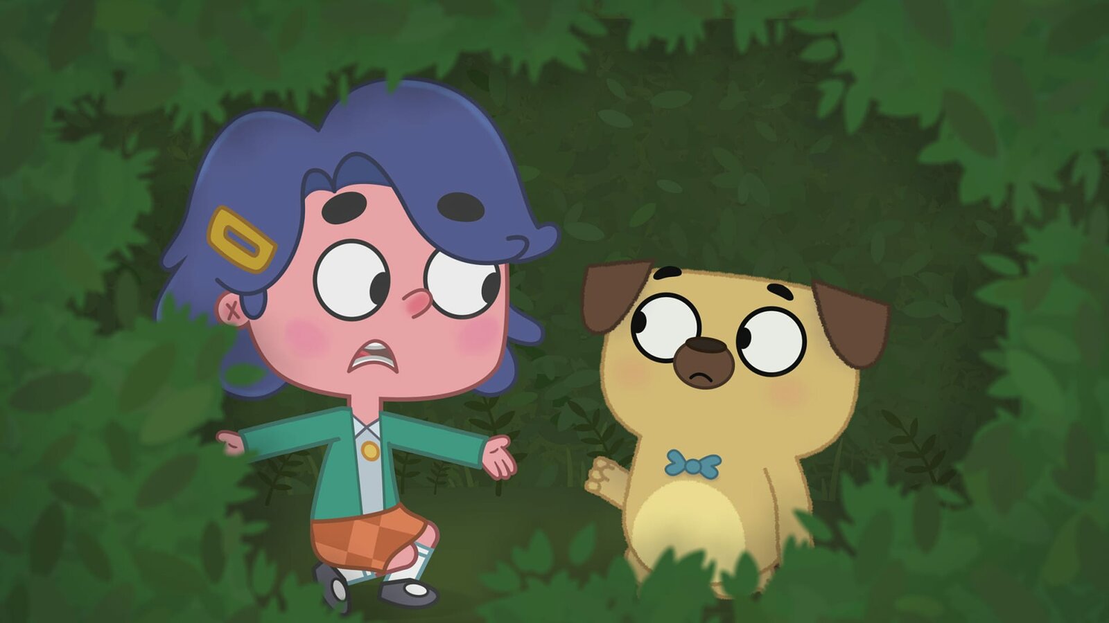 Die Geschichte vom Mädchen mit viel FantasieLeni und Puck verstecken sich im Gebüsch vor den bösen Buben.Bild: © KiKA/Dog Loves Productions Limited 2020