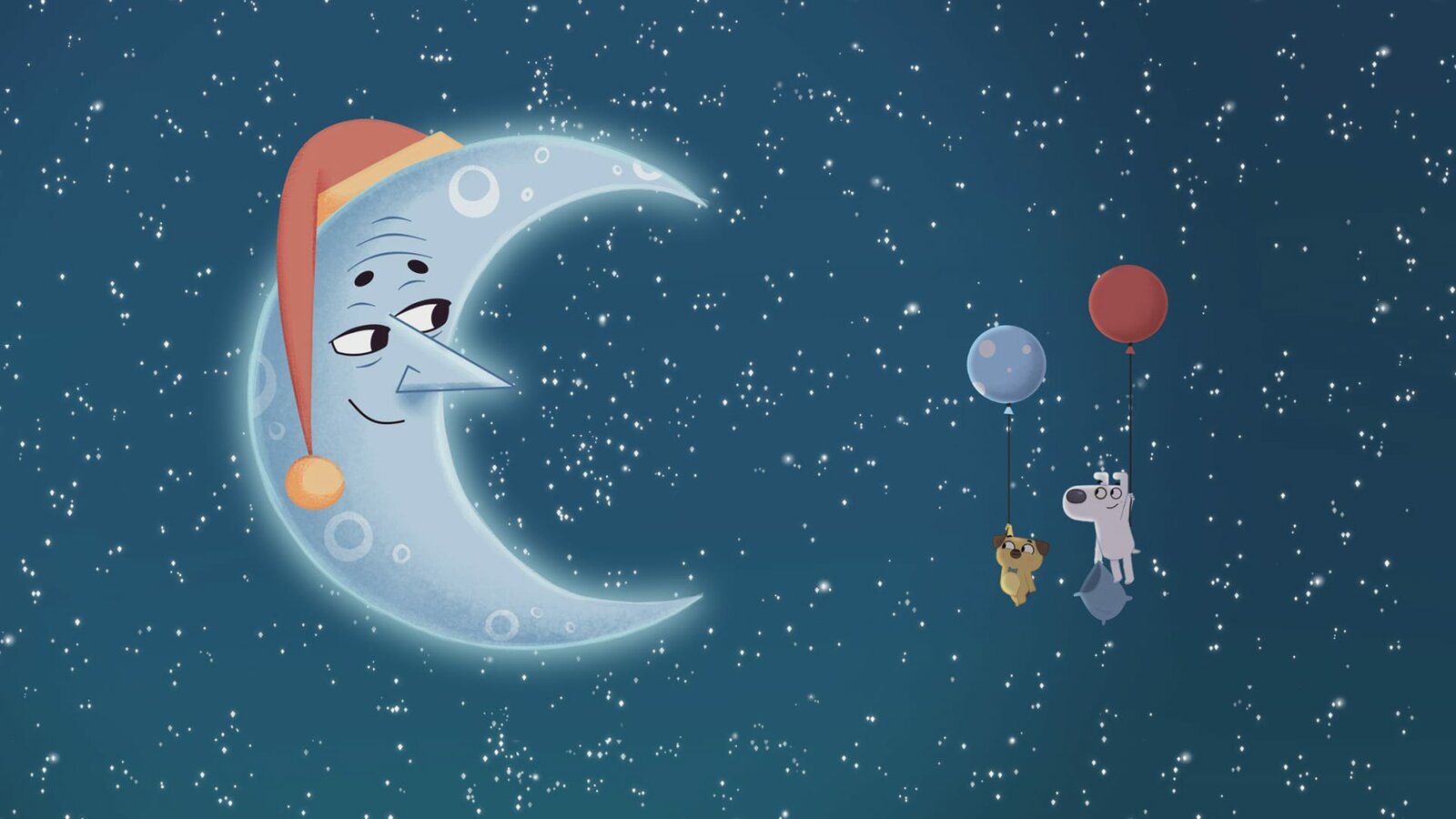 Die Geschichte vom Rätseln und SpielenBeim Mond angekommen, können Dog und Puck das magische Kissen wieder mit Mondstaub füllen.Bild: © KiKA/Dog Loves Productions Limited 2020