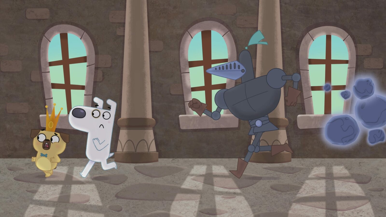 Die Geschichte von einer spannenden VerfolgungsjagdDog und Puck werden von Rittern verfolgt.Bild: © KiKA/Dog Loves Productions Limited 2020