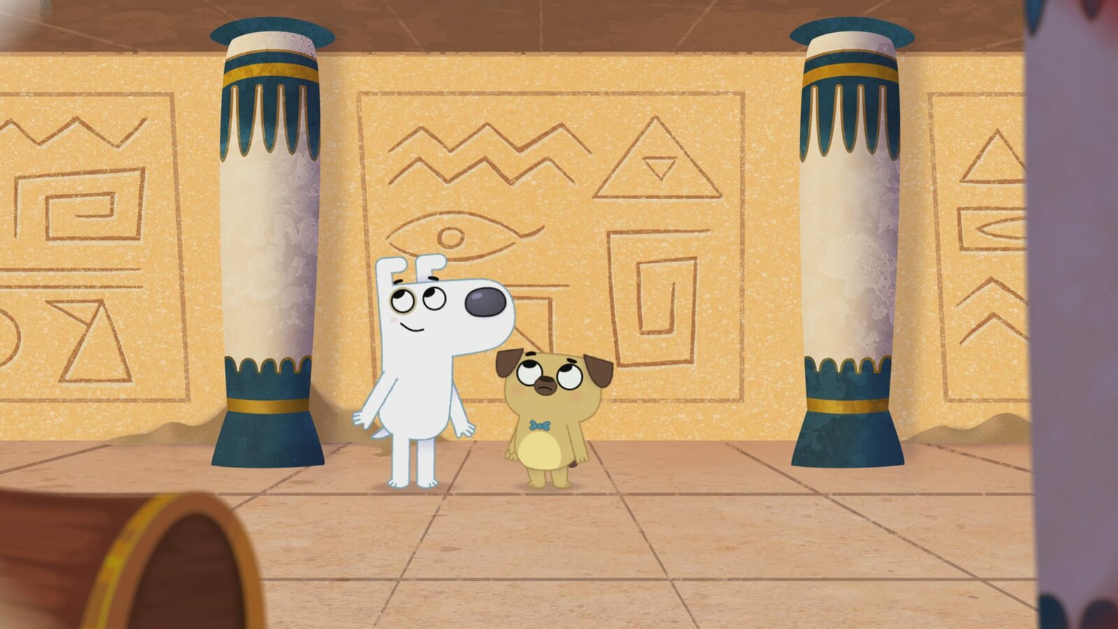 Die Geschichte von einer spannenden VerfolgungsjagdBei ihrer Verfolgungsjagd finden sich Dog und Puck in einer Pyramide wieder.Bild: © KiKA/Dog Loves Productions Limited 2020