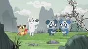 Die Geschichte von Pucks Suche nach der roten FederDie beiden Pandageschwister streiten sich um das letzte Bambusblatt.Bild: © KiKA/Dog Loves Productions Limited 2020